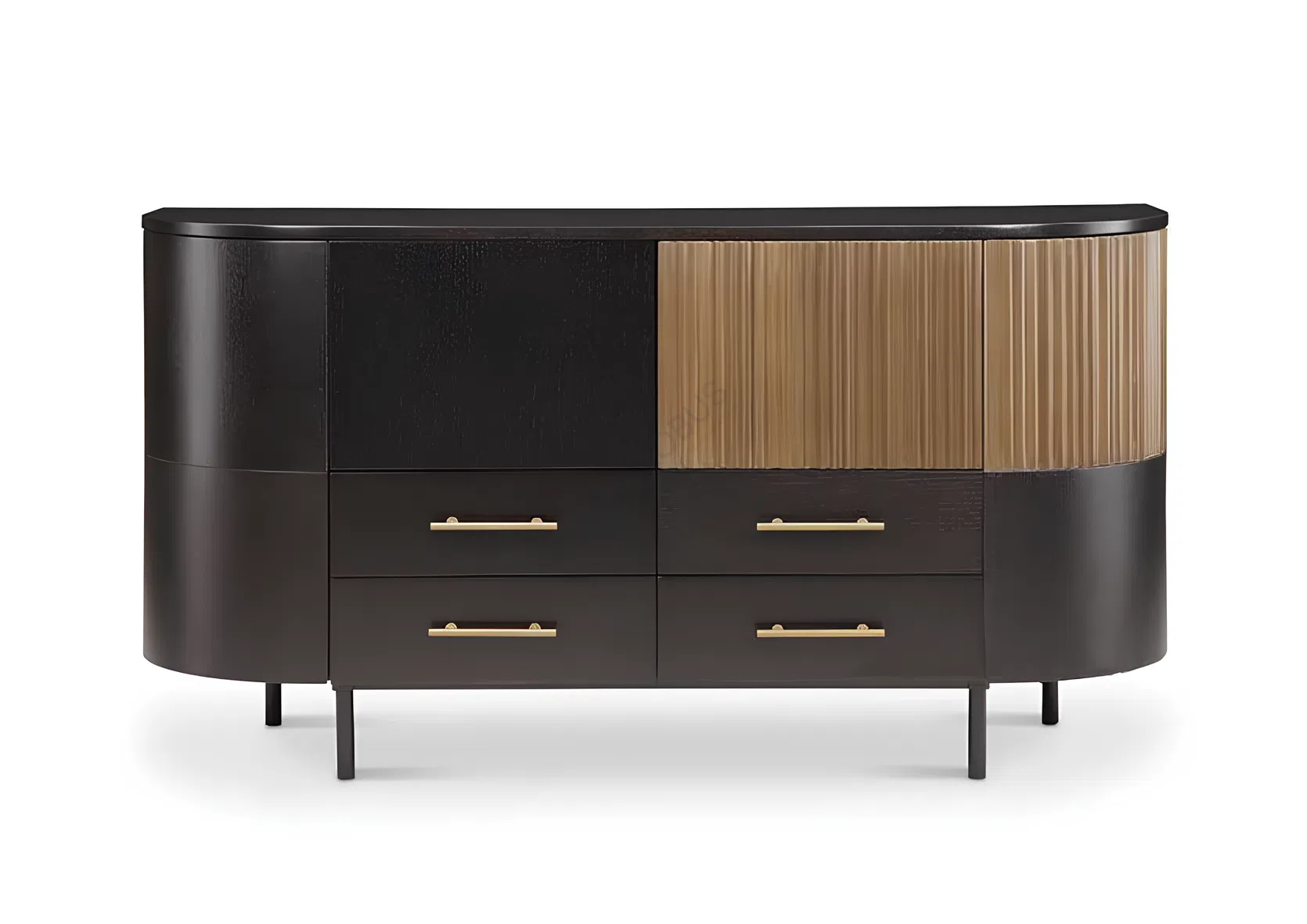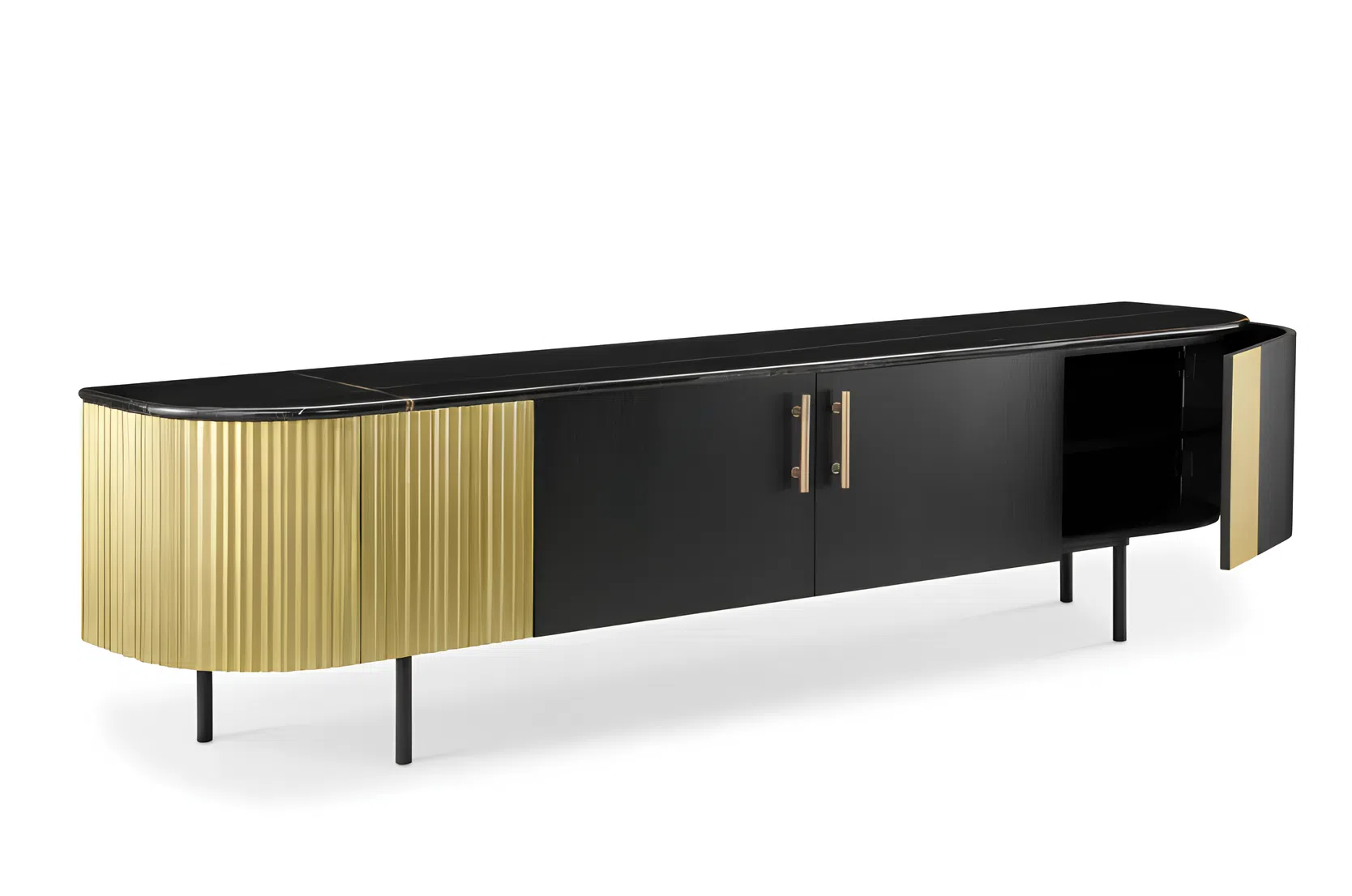 A refined modern sideboard with a natural marble top, a solid-wood body in deep black, and slim stainless-steel legs. Brass pulls and a vertical brass inlay bring a subtle glow, while the fluted door panel on one end adds texture and rhythm. Gently rounded corners soften the long silhouette and highlight the stone’s edge.