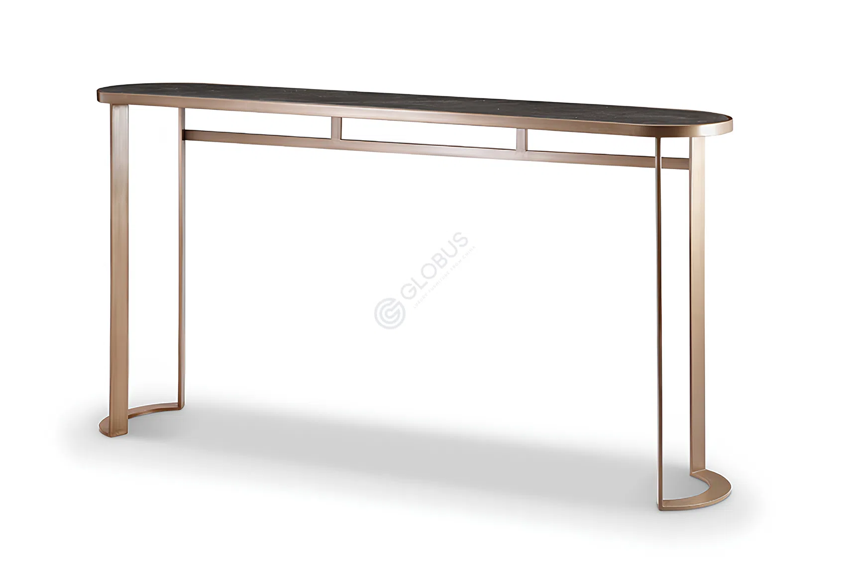 Its open, asymmetrical base is made of brushed stainless steel with a warm champagne finish, creating a light visual footprint while providing excellent stability. The precise lines and balanced proportions introduce a refined, modern character.