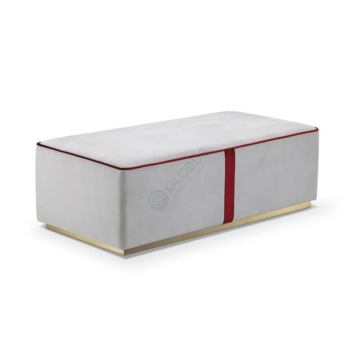 A vibrant red piping neatly outlines the transition between the two fabrics, adding a subtle line of color that defines the armchair's inviting shape. The design is grounded and compact, featuring a rounded base that contributes to its contemporary aesthetic.