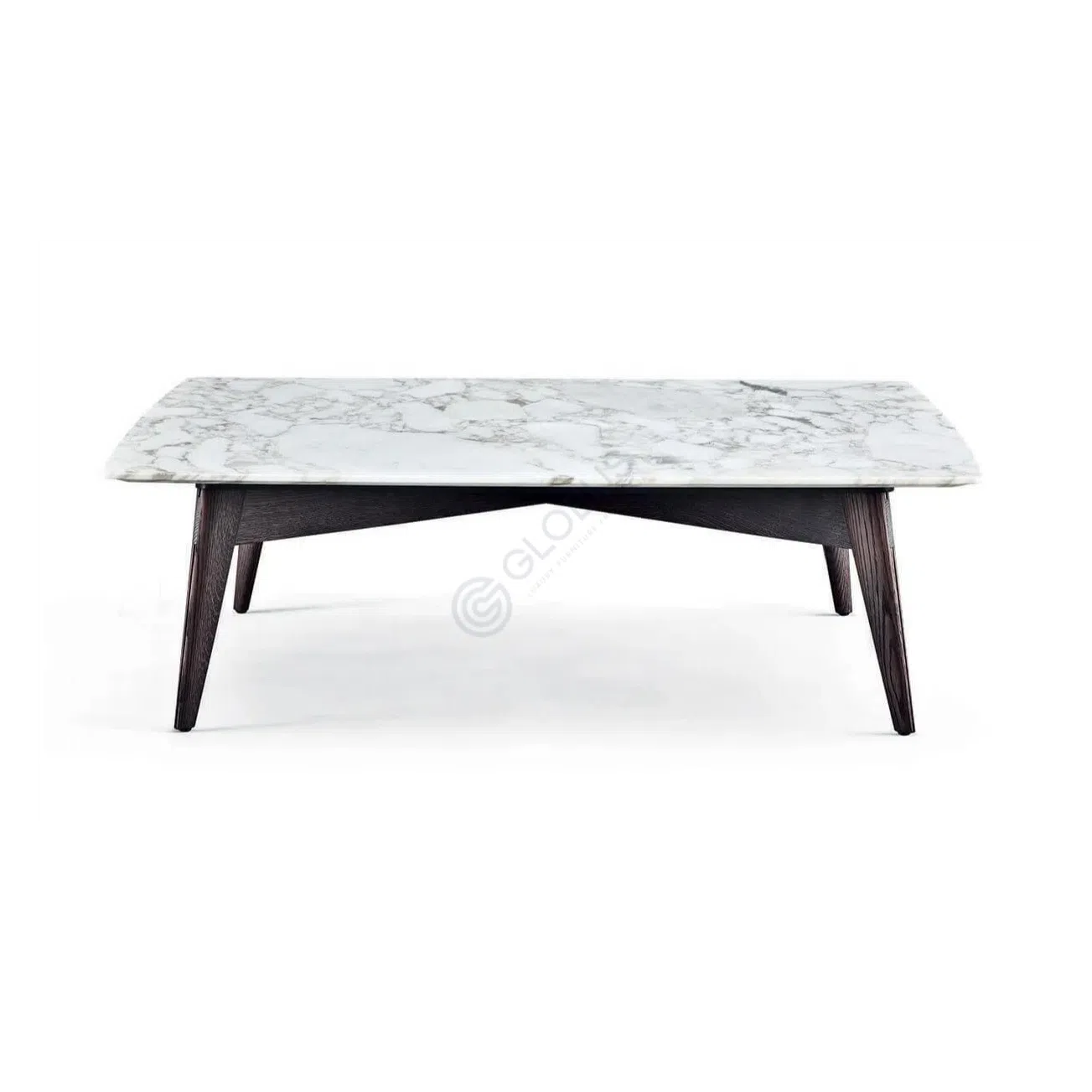 Supporting the top is a base constructed from solid wood. The legs are designed with a clean, tapered profile and joined by a simple cross brace, creating a stable and understated modern structure.