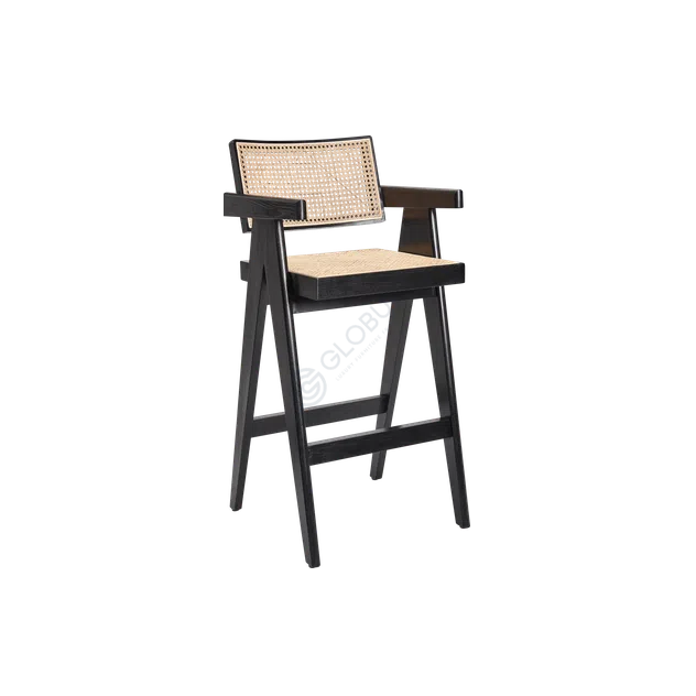 The armchair presents a refined balance of straight lines and gentle curves, with its solid wood frame forming a distinctive A-shaped base. A plywood support underlies the seat and back, ensuring lasting stability without adding bulk. Padded cylinders serve as armrests, their rounded form softening the overall silhouette.