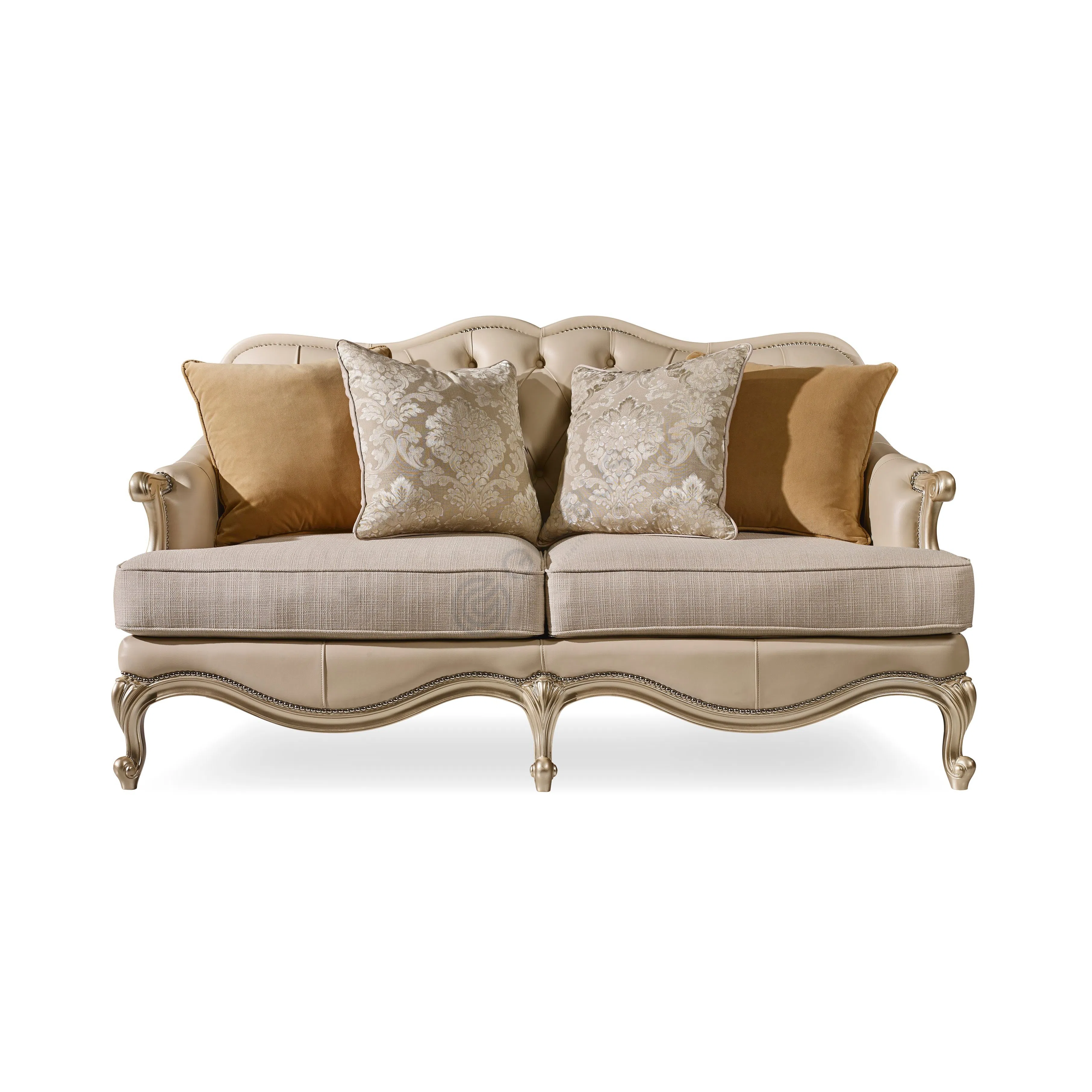 The piece is expertly crafted with a solid wood frame featuring delicate curves and subtle decorative carvings on the legs and arms. The frame boasts a refined finish, adding a touch of classic luxury.