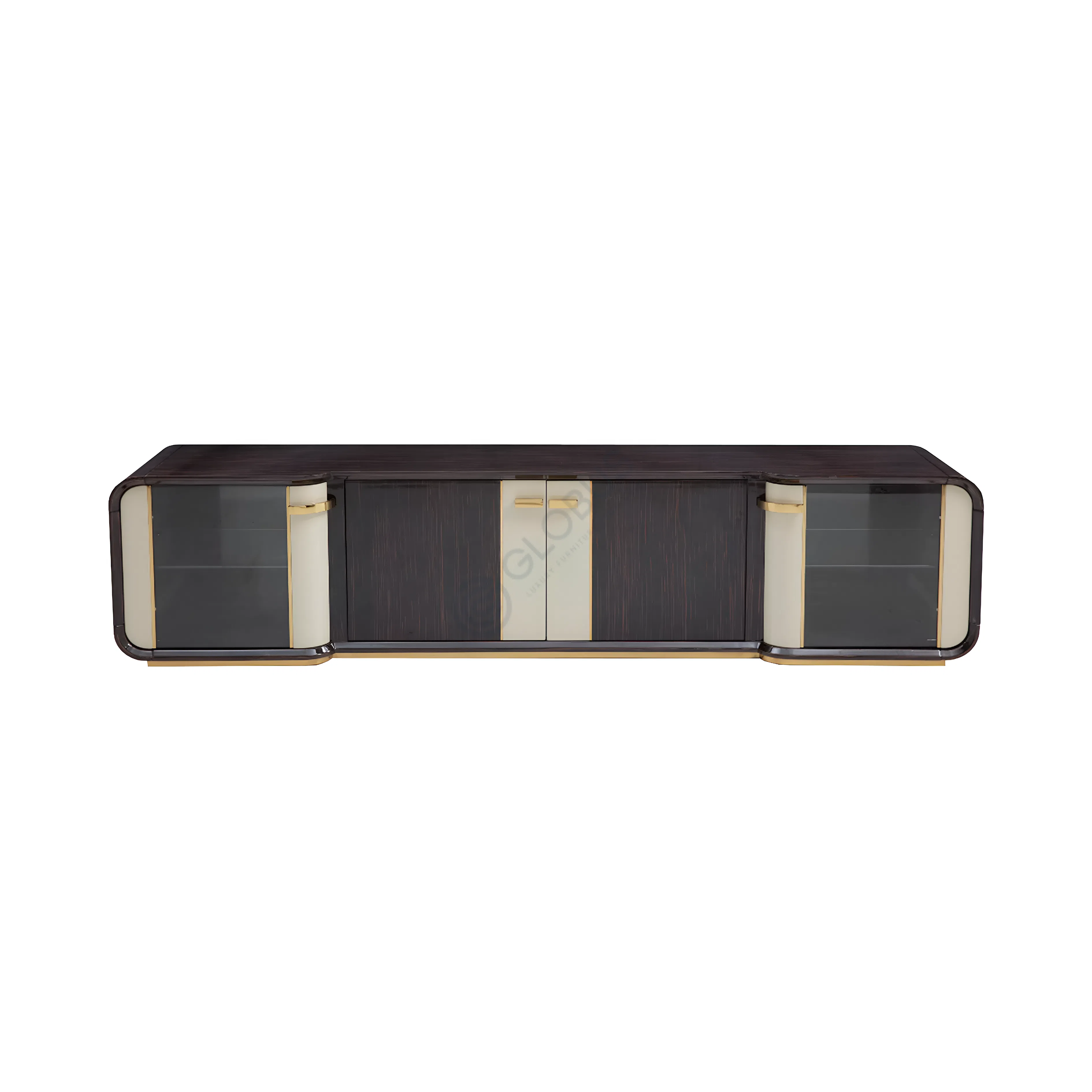 This console features a striking modern design defined by its smooth, curved silhouette and clean lines. The elegant waterfall shape creates a continuous, flowing form that serves as a sophisticated focal point in any room.