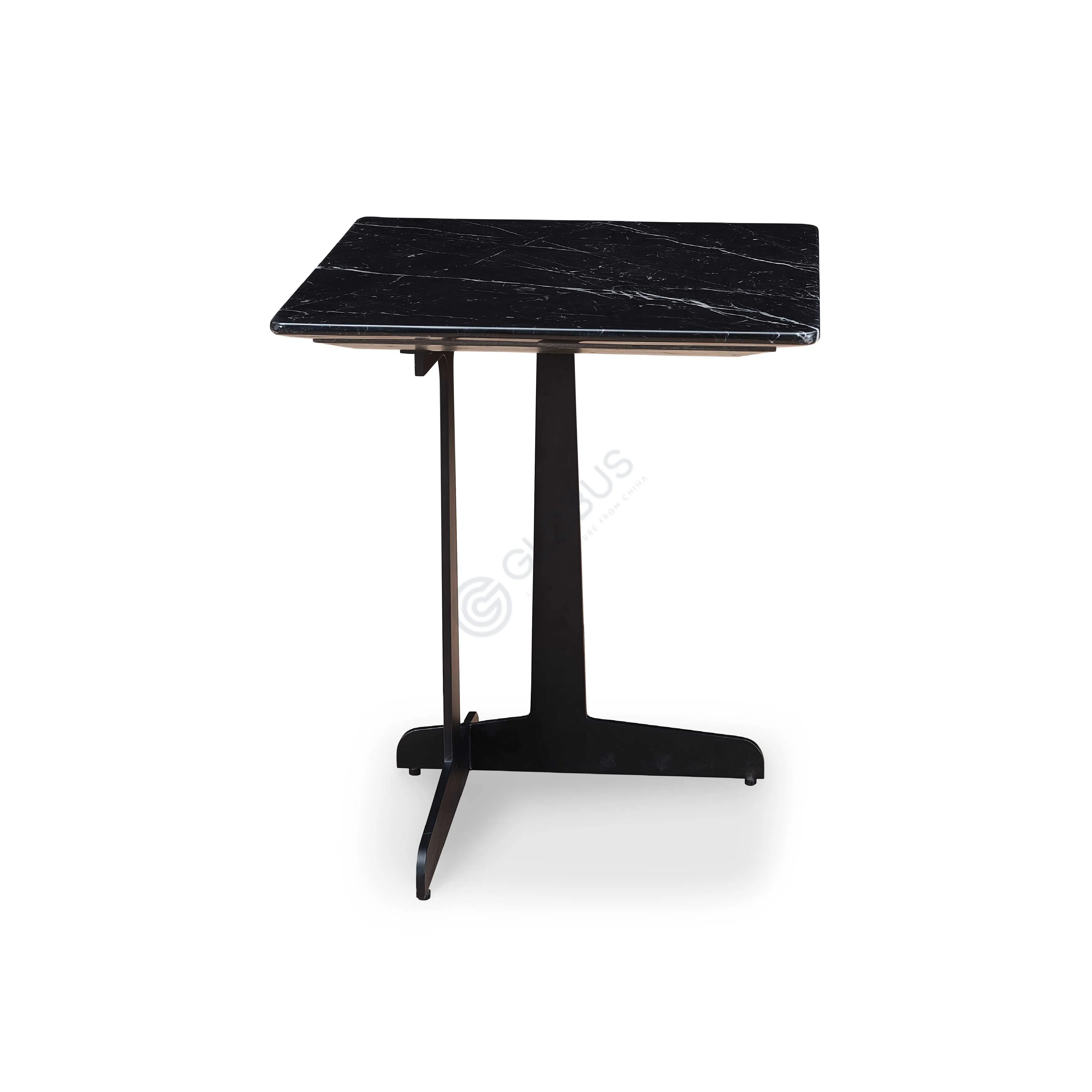 Supported by a sturdy iron base, the table stands on three legs arranged in a balanced, angular design. This unique structure not only assures stability but also adds a touch of modern edge, making it fit seamlessly into contemporary interiors.