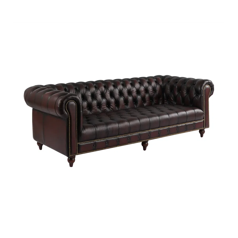 This armchair brings together the warmth of solid wood craftsmanship and the distinguished touch of top-quality leather. The deep brown upholstery is carefully tufted, giving the piece its recognizable American classic look. Brass nailhead detailing lines the arms and front panel, adding subtle sophistication to its structure.