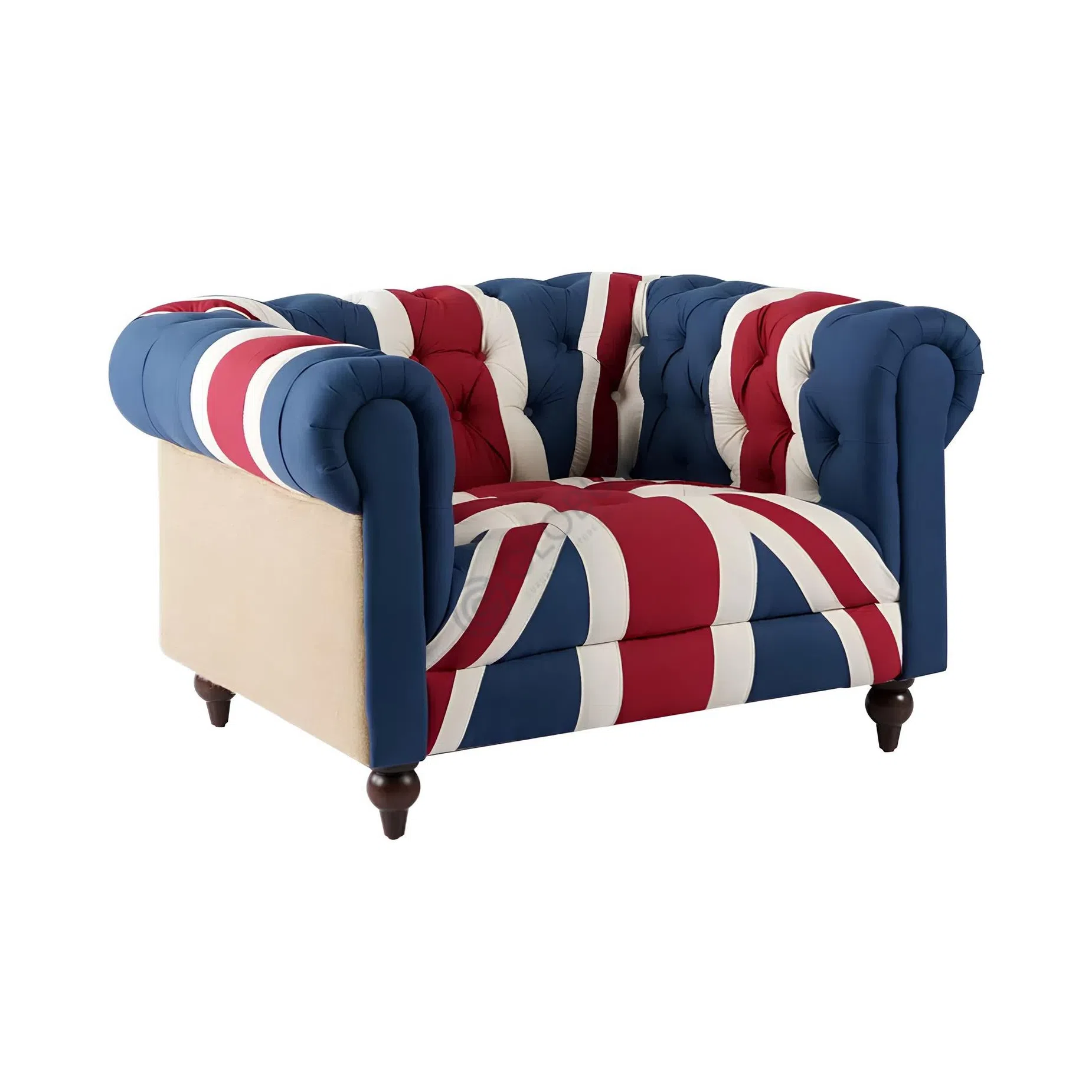 This sofa features a bold design with the Union Jack motif, making it a striking centerpiece for any living room. Upholstered in high-quality textile, it balances comfort and durability, while the deep button-tufted backrest brings in classic charm. The solid wood frame and legs provide reliable support and a touch of sophistication.