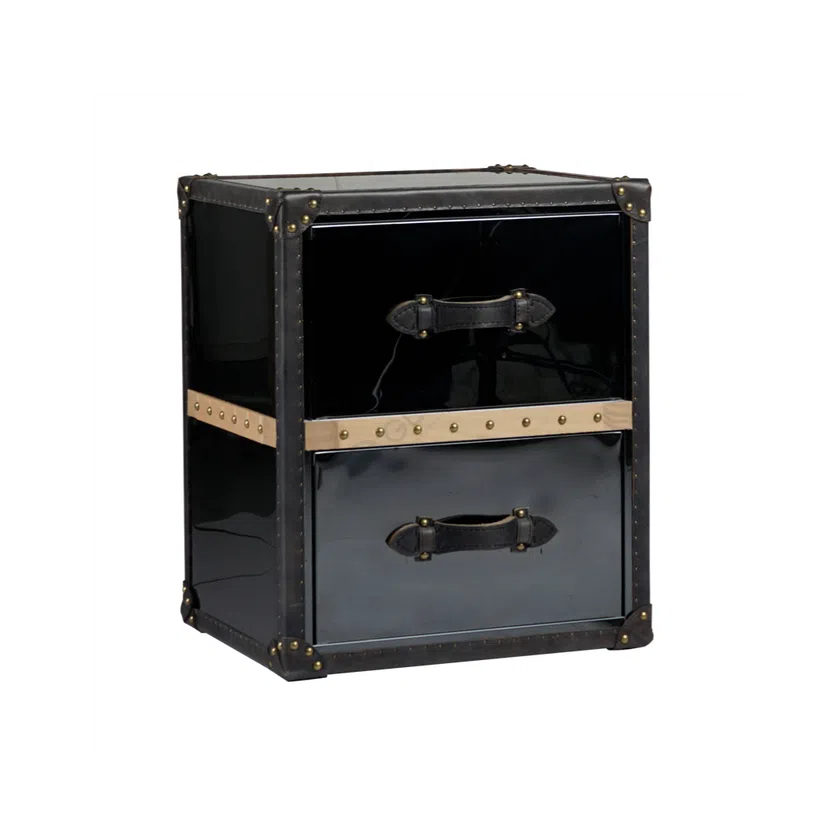 Crafted from durable aluminum, the dresser offers a sleek, metallic finish that catches the light. This cool, contemporary material is beautifully contrasted by the warm, natural appeal of its leather strap handles. Each handle is thoughtfully secured, providing a comfortable grip while enhancing the piece's rugged yet refined charm. It features two spacious drawers, offering practical storage for various items.