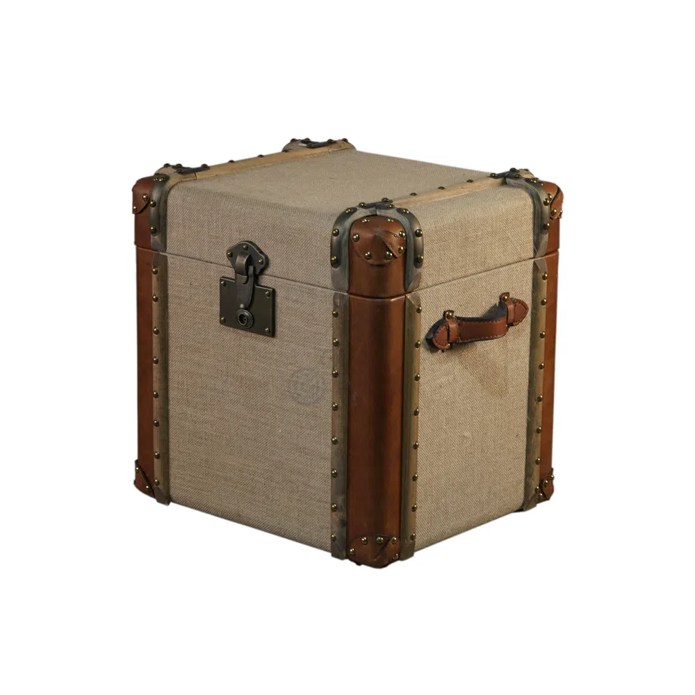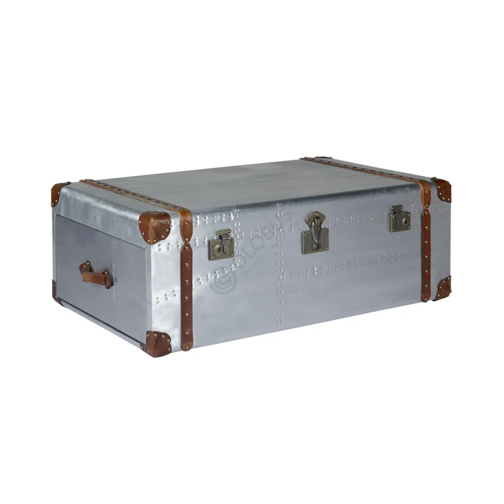 The design incorporates a robust solid wood structure, carefully reinforced with aluminum banding along its edges and corners. Rich leather straps serve as the functional drawer handles, providing a warm, tactile contrast to the cool metallic surfaces. Complementary leather details also adorn the corners, enhancing its authentic trunk-like appearance.