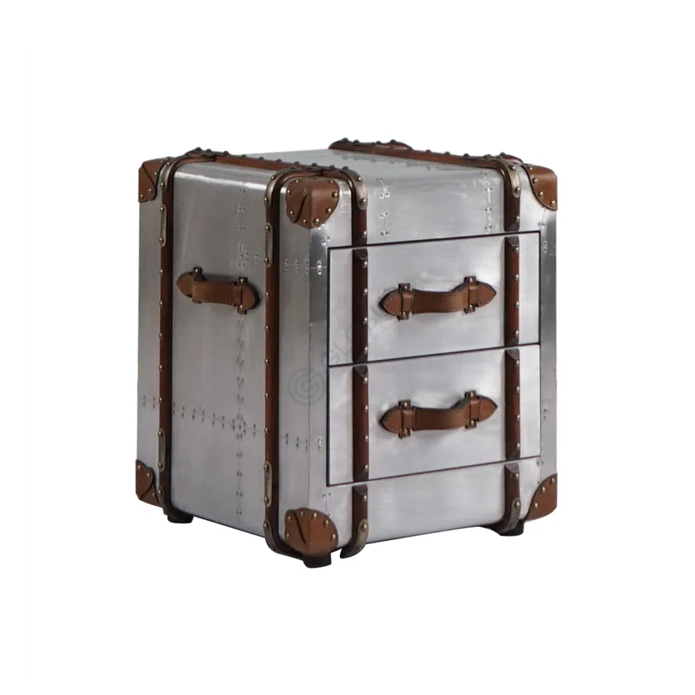 This unique chest of drawers draws its inspiration from vintage travel trunks, seamlessly integrating a distinctive loft style into any living room or bedroom setting. Its exterior is expertly clad in durable aluminum, featuring prominent rivets that evoke a refined industrial or aviation aesthetic.