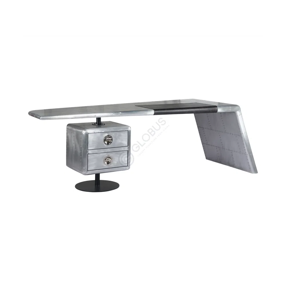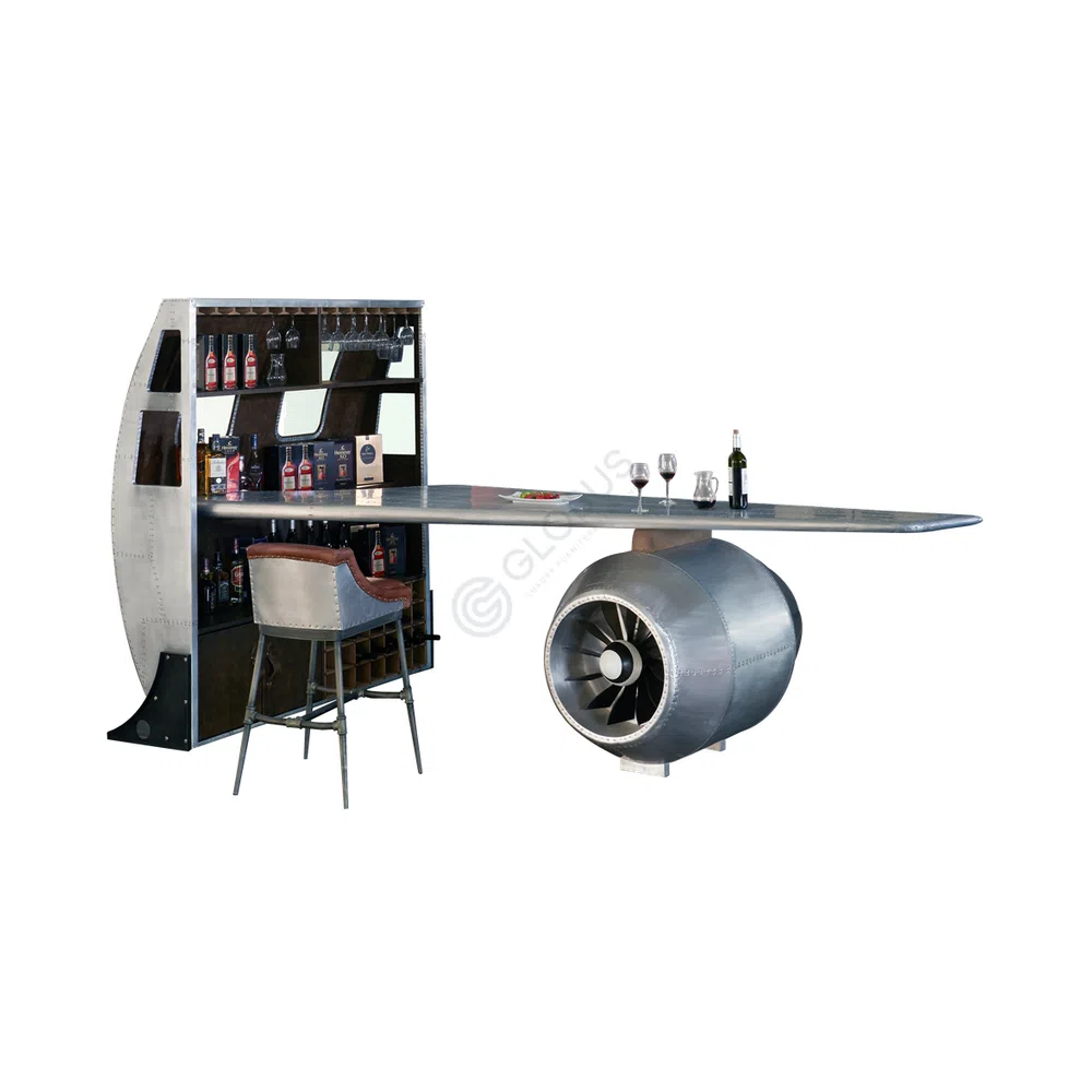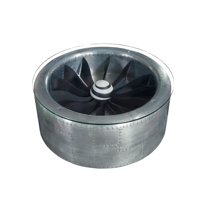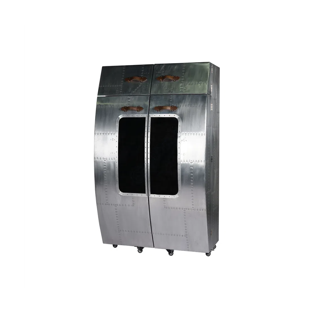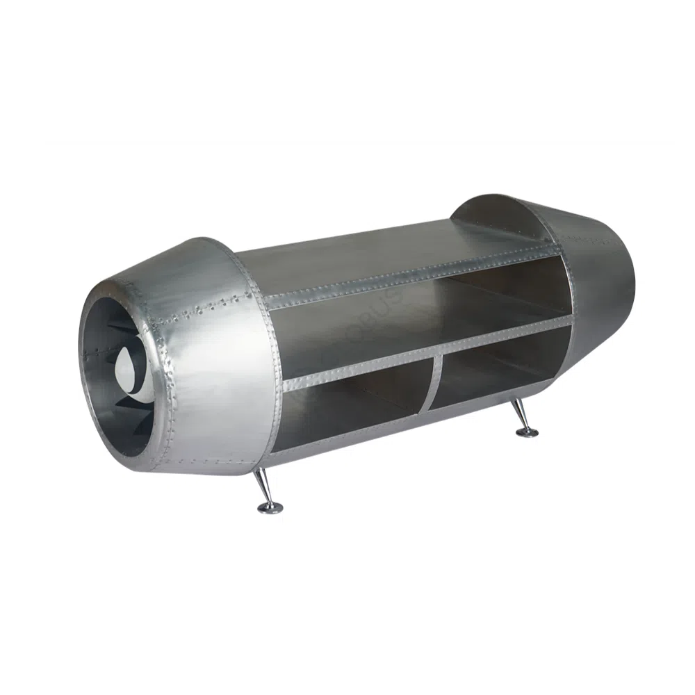 A distinctive feature is the meticulous riveting that adorns the side panels, arranged in a sophisticated diamond pattern. This detail provides a rich texture and a nod to vintage aviation construction. The polished surface catches the light, highlighting the subtle variations in the metal and the precision of the hand-applied rivets, creating a unique visual appeal from every angle.