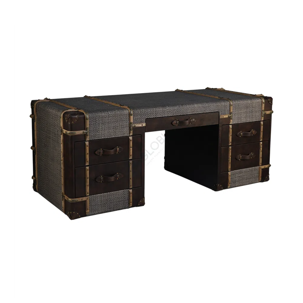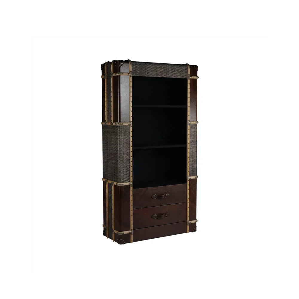 Carefully crafted details enhance its unique appeal. Rich brown leather straps elegantly frame the edges and corners, secured with sturdy metal studding, providing a warm contrast to the cool aluminum. The front showcases three functional drawers, each fitted with a durable leather strap handle, offering practical storage solutions for everyday essentials.