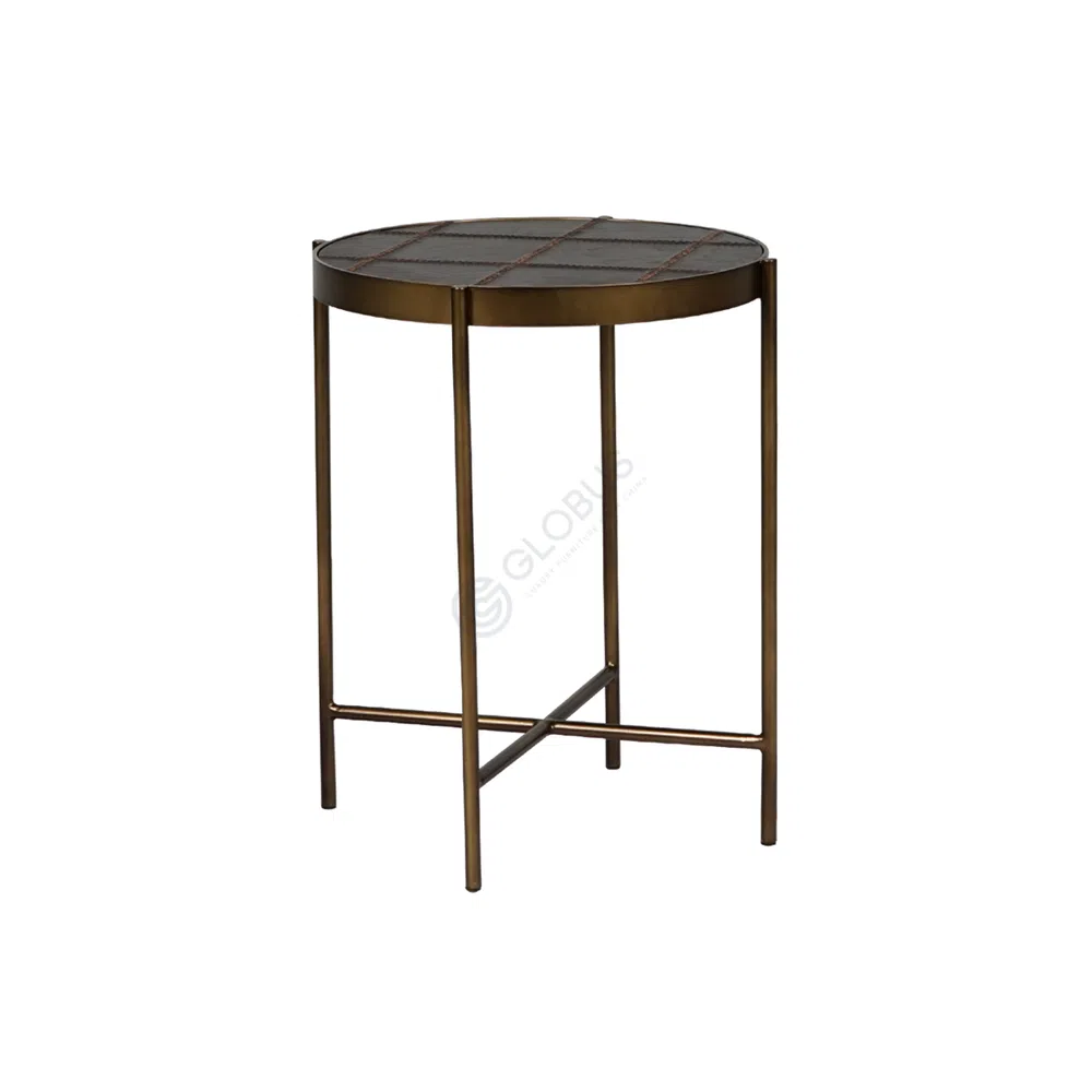Crafted with a rich leather top, the table features an intriguing grid pattern stitched directly onto its surface, creating visual depth and texture. This luxurious top rests upon a slender, yet sturdy, iron frame, finished in a warm, antique bronze tone that complements the deep hues of the leather.
