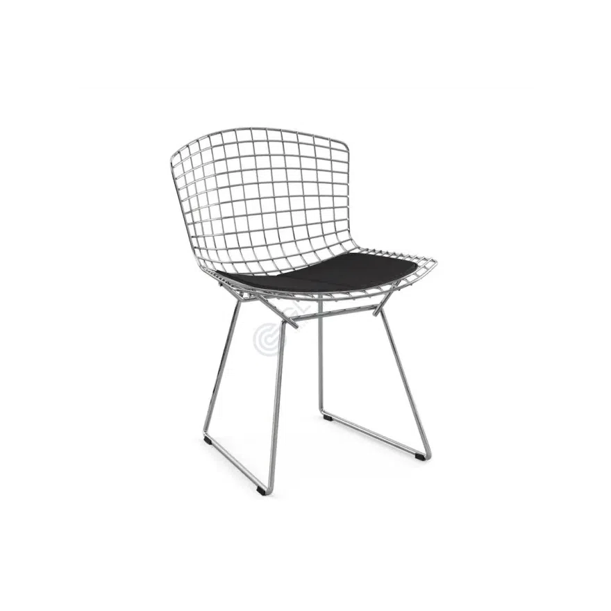 Crafted from polished metal, the seat and back form a distinctive grid. A circular seat pad, upholstered in smooth artificial leather (PVC), provides a comfortable surface and introduces a contrasting texture and color element to the metallic structure.
