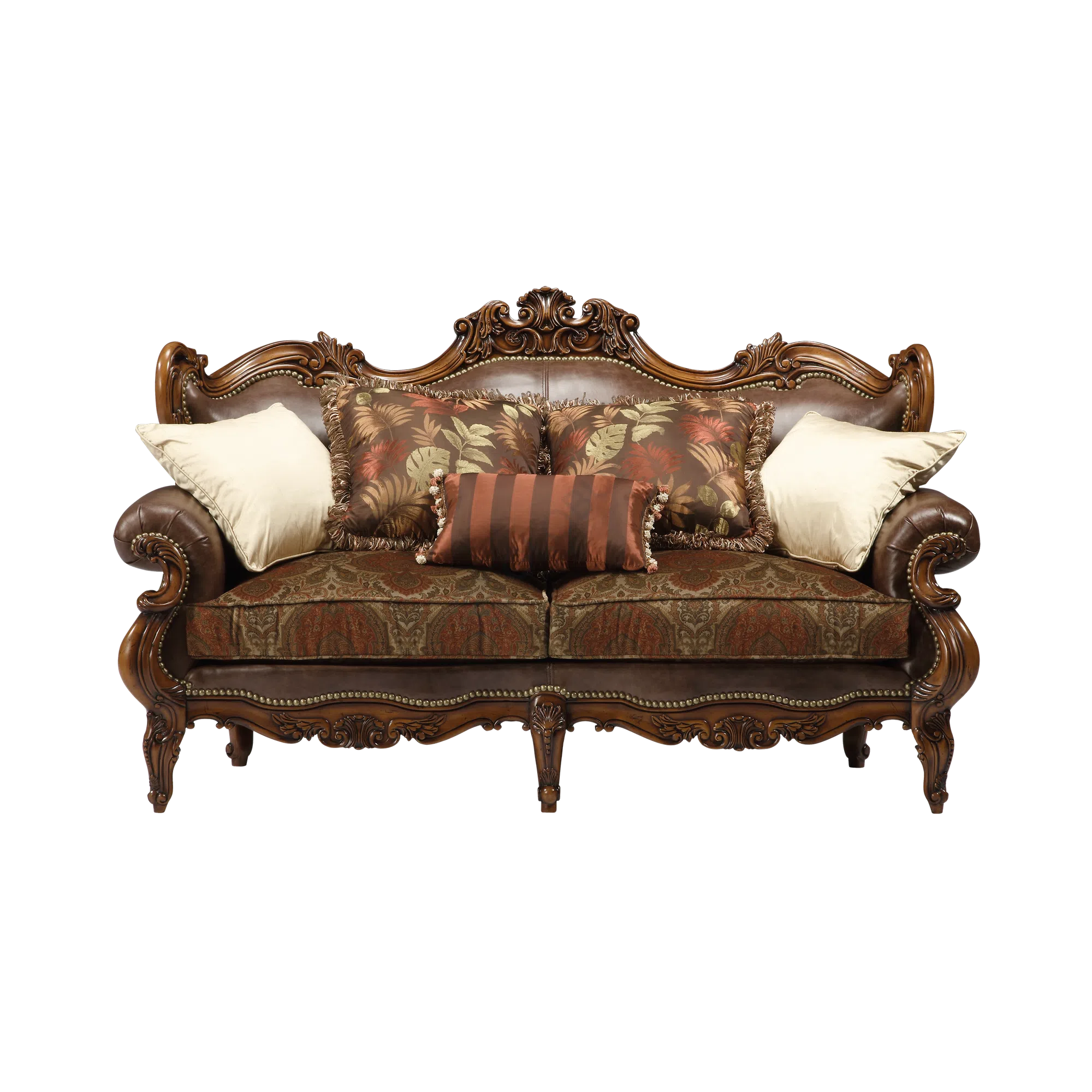The construction utilizes a sturdy frame made from solid wood and MDF, featuring elaborate carved details that showcase artisanal skill along the arms, legs, and upper back. Supple, dark brown leather provides a luxurious feel and texture on the arms and outer portions, complemented by classic nailhead trim accenting the lines of the frame.