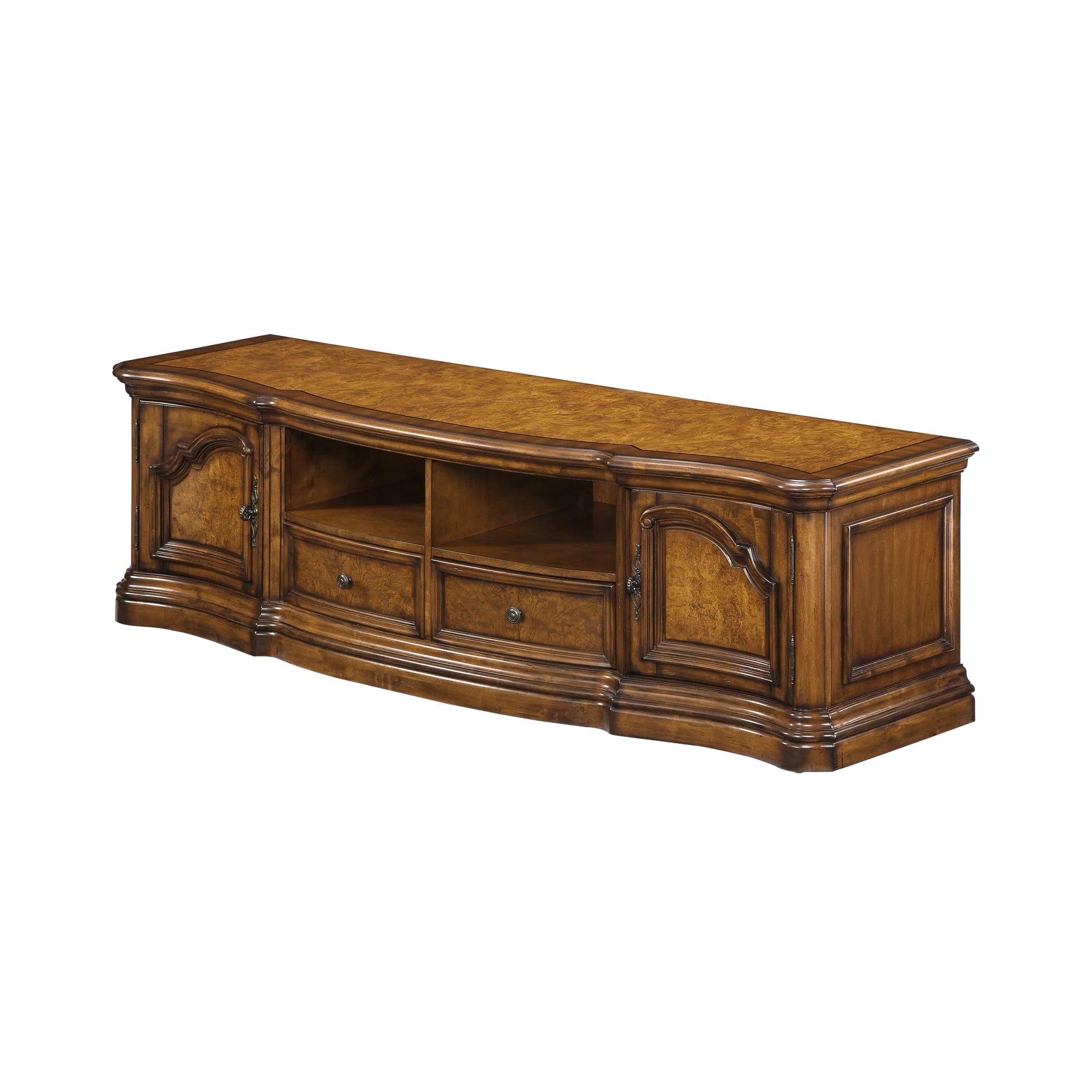 The design harmoniously blends classic aesthetics with modern utility, featuring ample storage and display options. The spacious top surface offers an ideal platform for a wide range of TV sizes, while the open shelving is perfect for organizing electronics and media accessories. For items preferring discretion, the ornate cabinet doors reveal additional space, keeping your living area tidy and well-arranged.