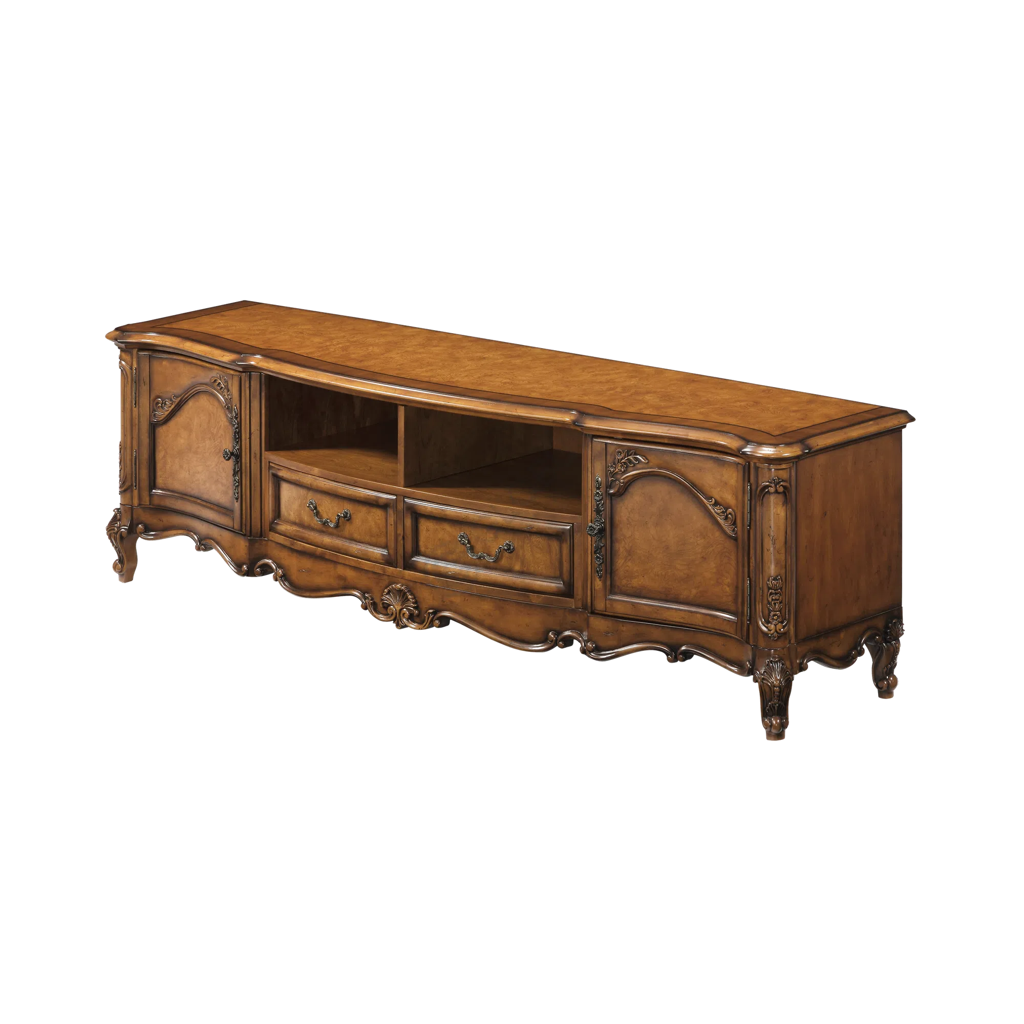 This TV stand features a refined European classic design, crafted from solid wood, MDF, and finished with a natural veneer. Its profile is distinguished by graceful curves, detailed floral carvings, and elegant cabriole legs, lending a sense of sophistication to both living rooms and bedrooms.