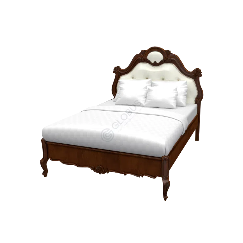 The bed frame continues this classic aesthetic with further carved embellishments along the rails and legs, all finished in a warm, rich tone. This design provides a sense of historical grandeur and craftsmanship.