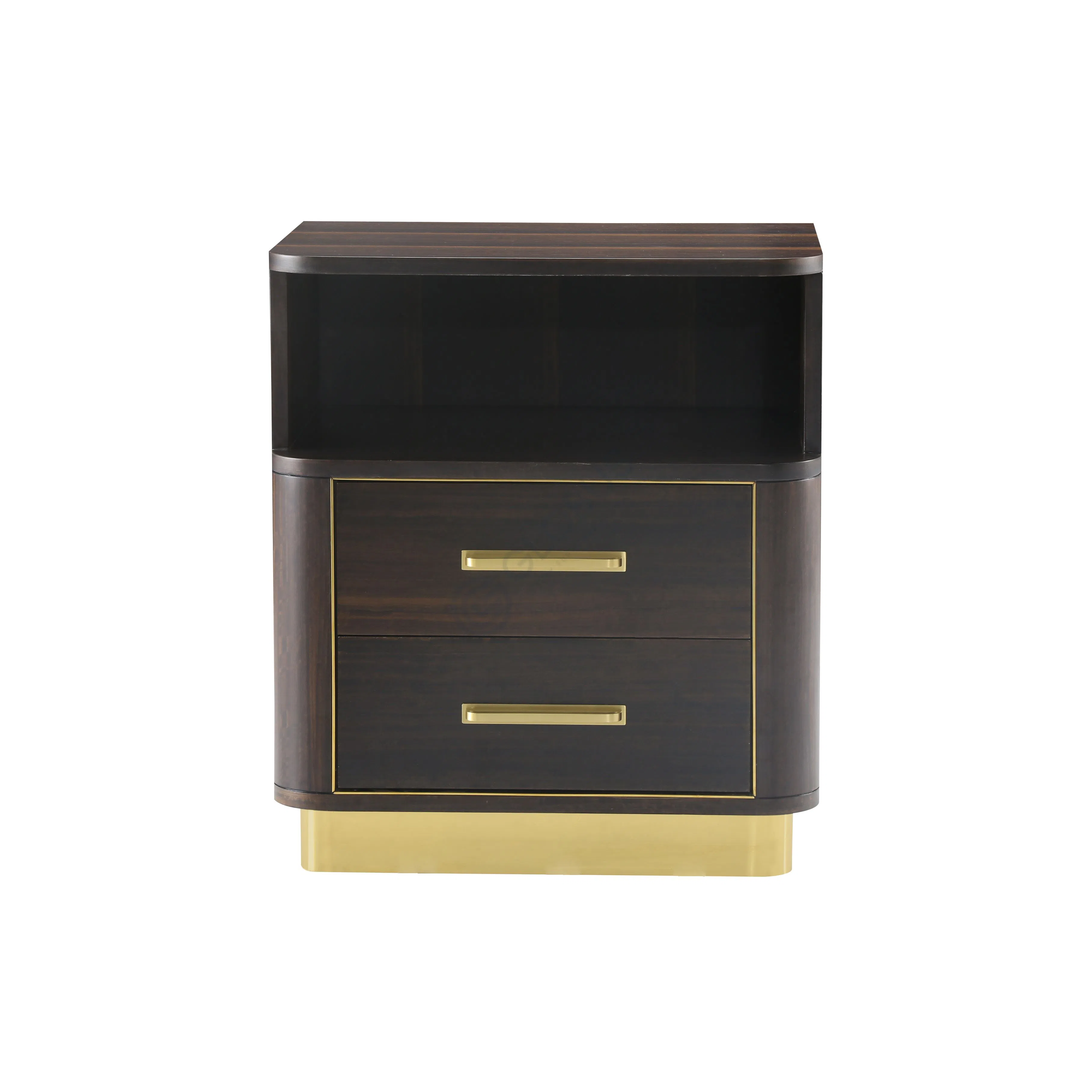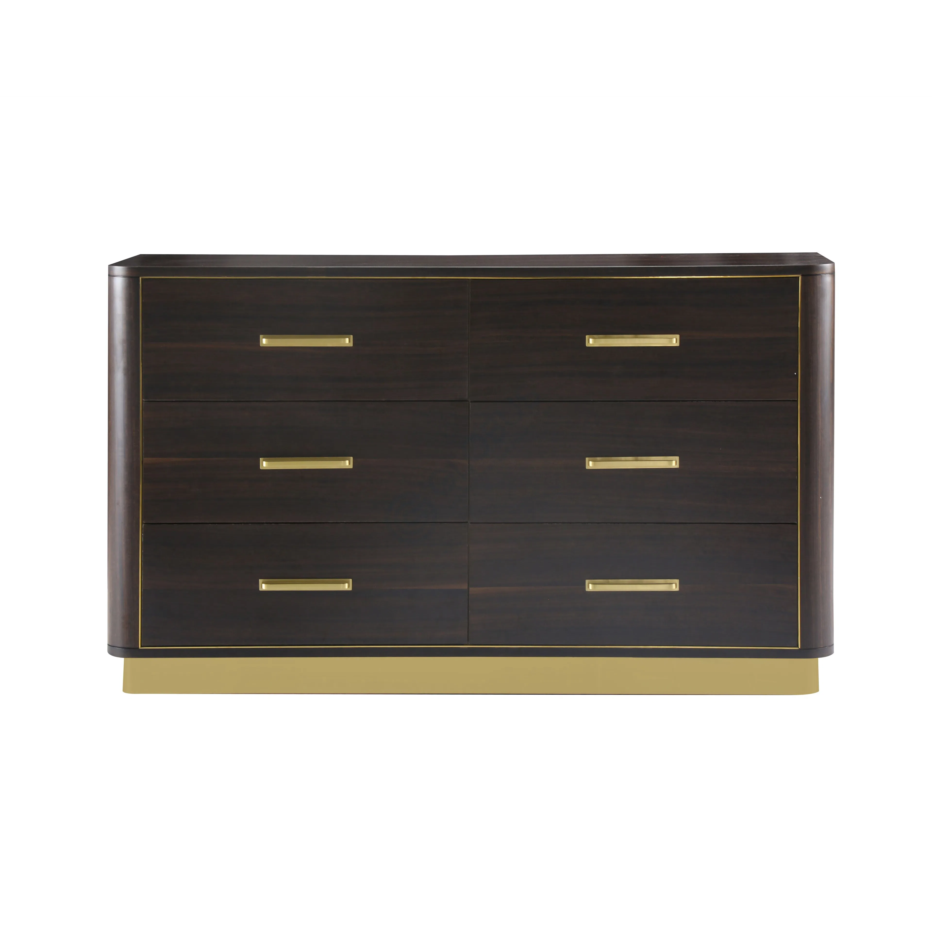 Crafted from a combination of solid wood, natural veneer, and durable MDF, the piece is built with quality and longevity in mind. The design is subtly enhanced by refined gold-toned detailing that outlines the drawers and doors, complementing the deep wood finish and adding a touch of subtle glamour. The tapered legs, tipped with coordinating gold accents, complete the distinguished look.