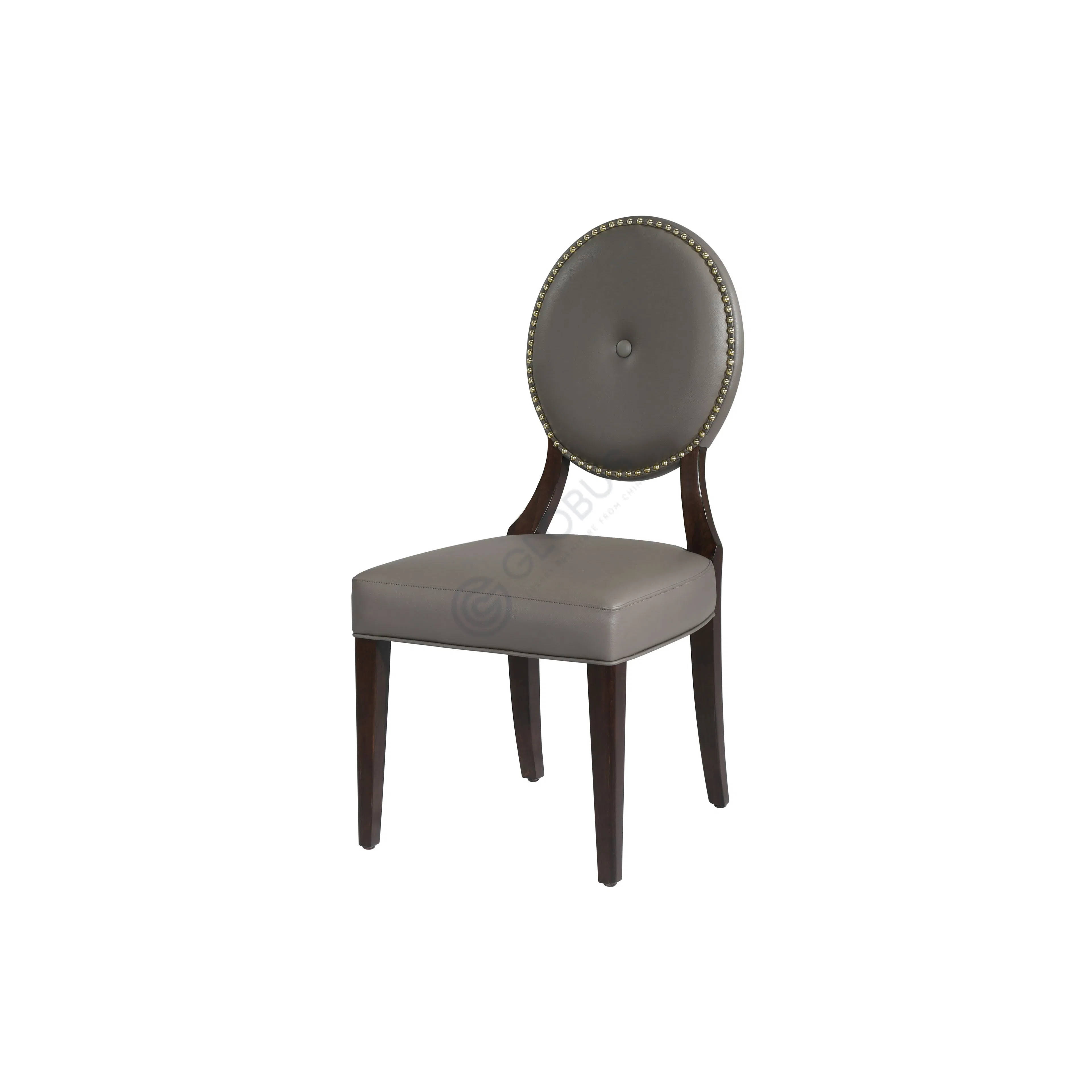 This elegant dining chair embodies neo-classic design, offering a sophisticated presence for any dining room or kitchen. It features a distinctive circular backrest and gracefully curved arms, providing both visual appeal and support.