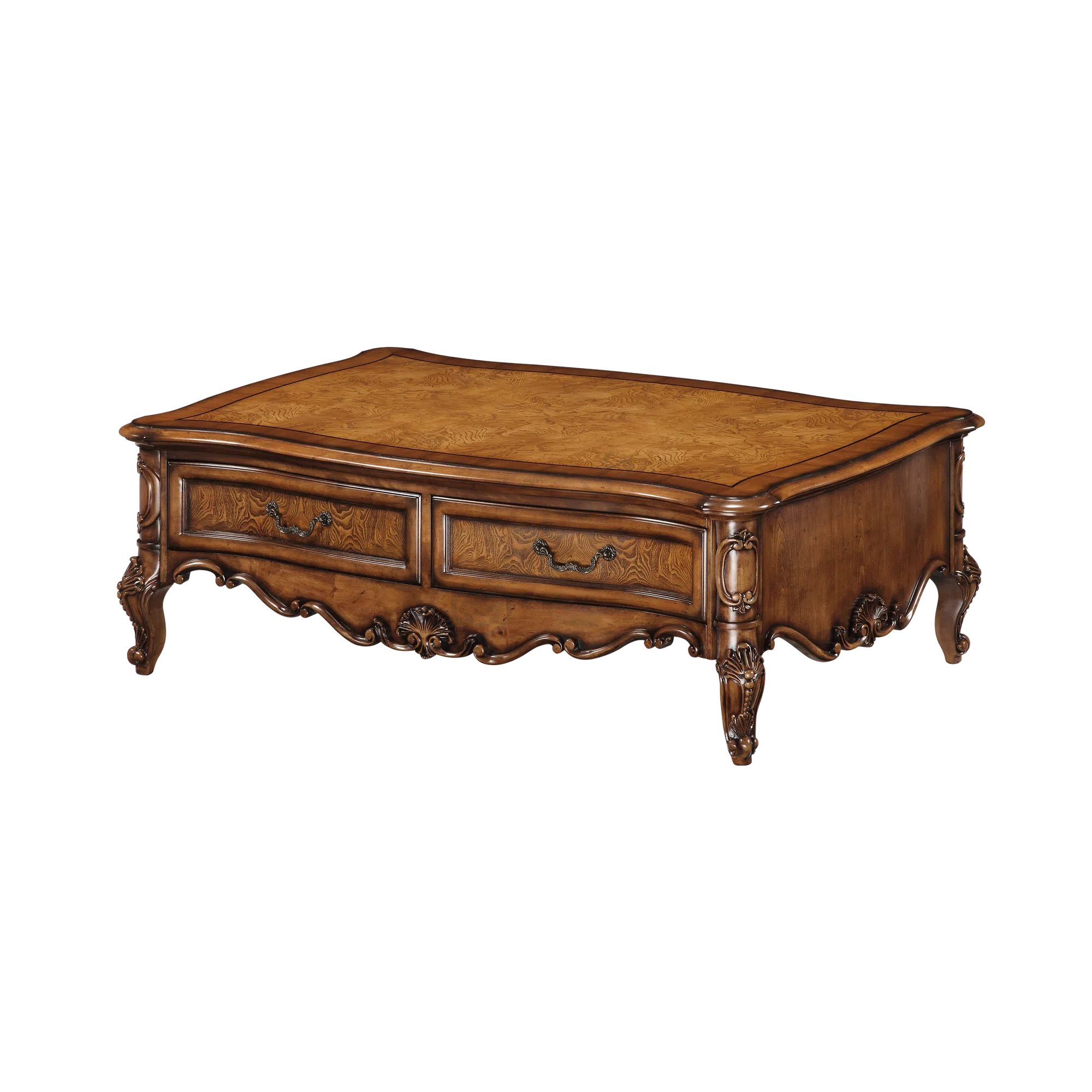 Two spacious drawers provide convenient storage, while the refined wood grain and warm finish bring a sense of elegance to any space. Its balanced proportions and decorative carved accents make it a tasteful complement to a variety of interiors, blending practicality with classic style.