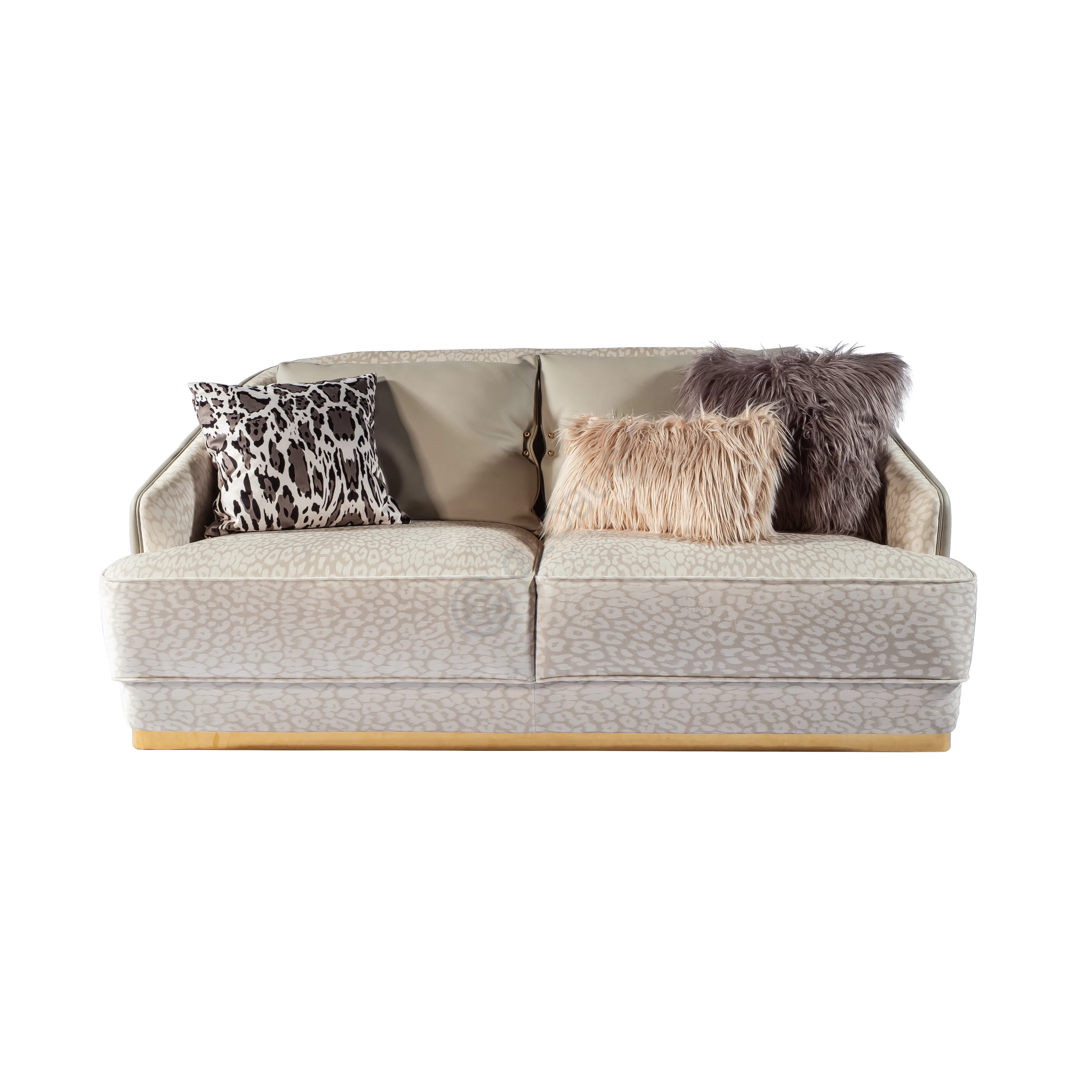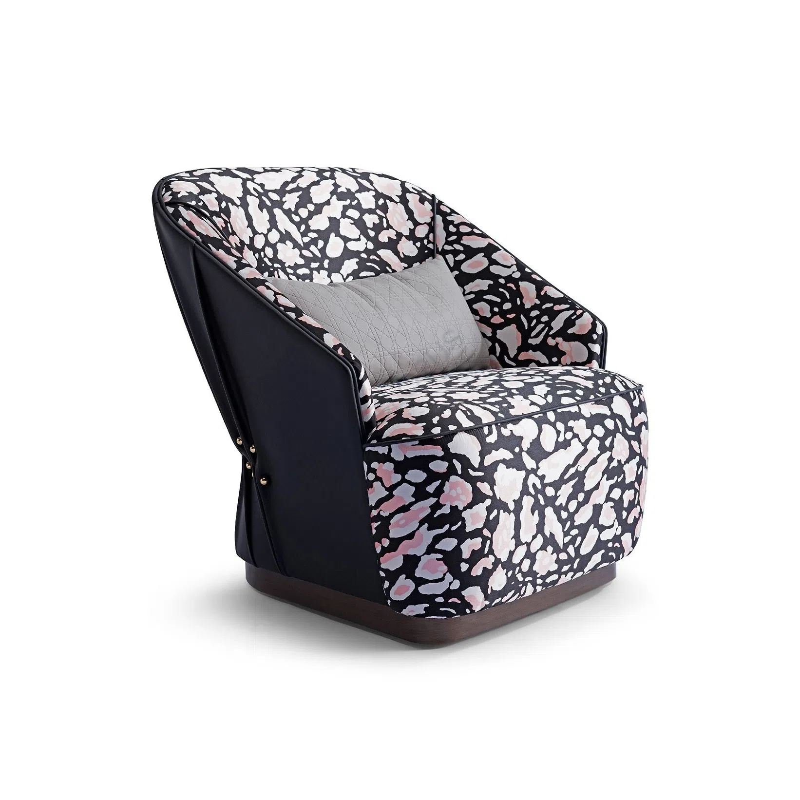 The upholstery features a sophisticated mix of microfiber leather and textile, creating a tactile experience that balances luxury and comfort. With its black leatherette body accented by metallic stud detailing and a soft, animal-print seat, the pouf introduces a playful yet sophisticated flair.