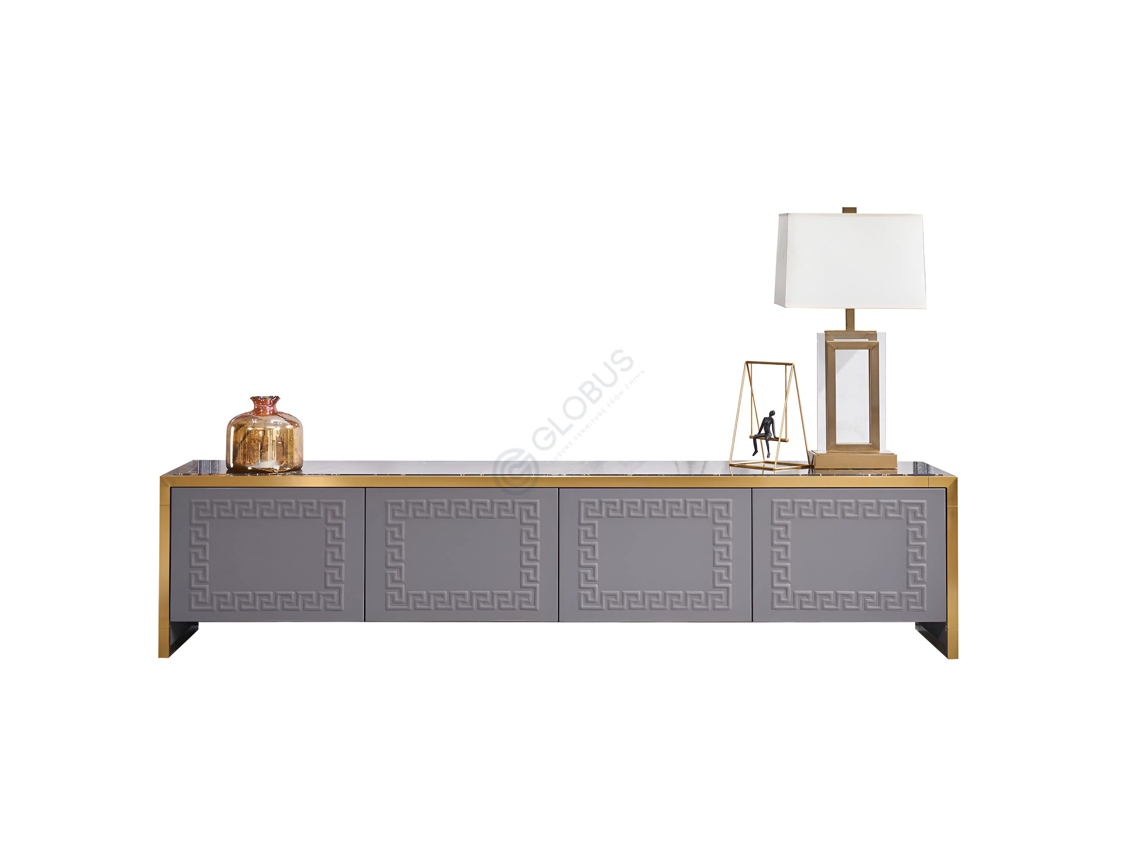 The table's sturdy base, constructed from plywood and clad in a refined dark grey microfiber leather, provides a distinguished foundation. Golden metal accents elegantly frame the marble top and define the table's silhouette, adding a touch of refined brilliance. Along its sides, a subtly embossed Greek key pattern on the leather offers an intricate detail, drawing inspiration from classic Art Deco motifs.