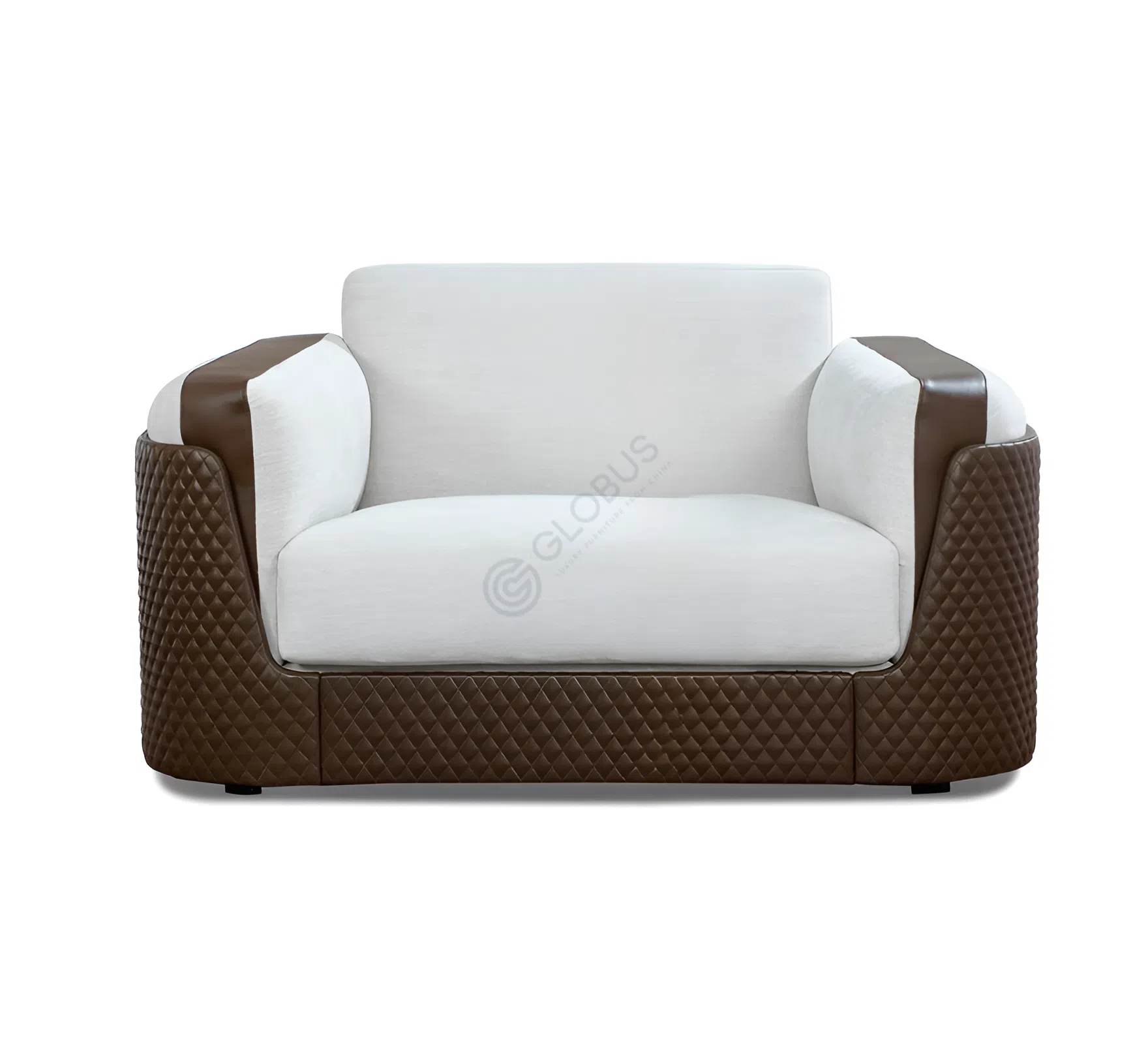 This modern sofa presents a striking balance of contemporary design and inviting comfort. Its two-tone upholstery features a light, soft textile for the seating and back cushions, creating a bright and welcoming presence. A sophisticated contrast is introduced by the rich, dark textile that encases the lower frame and outer armrests, detailed with a subtle diamond quilting for an added layer of visual interest.