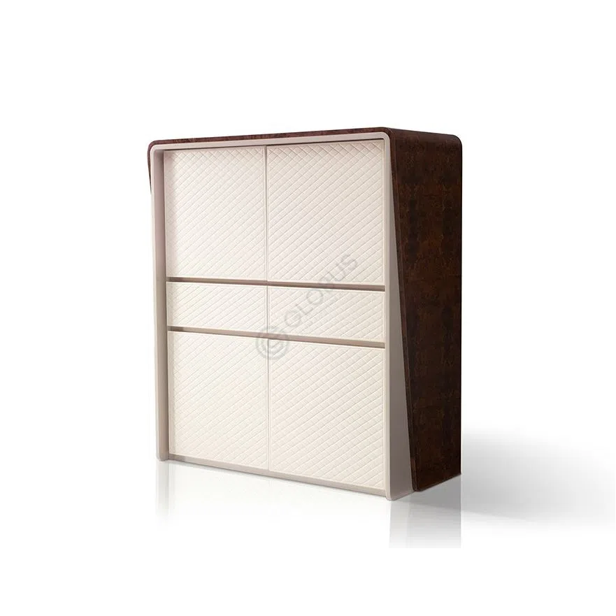 Designed to complement both living room and bedroom interiors, this dresser serves as a functional storage unit while enhancing the room's aesthetic. Its sophisticated design and material combination make it a focal point in a luxurious setting.