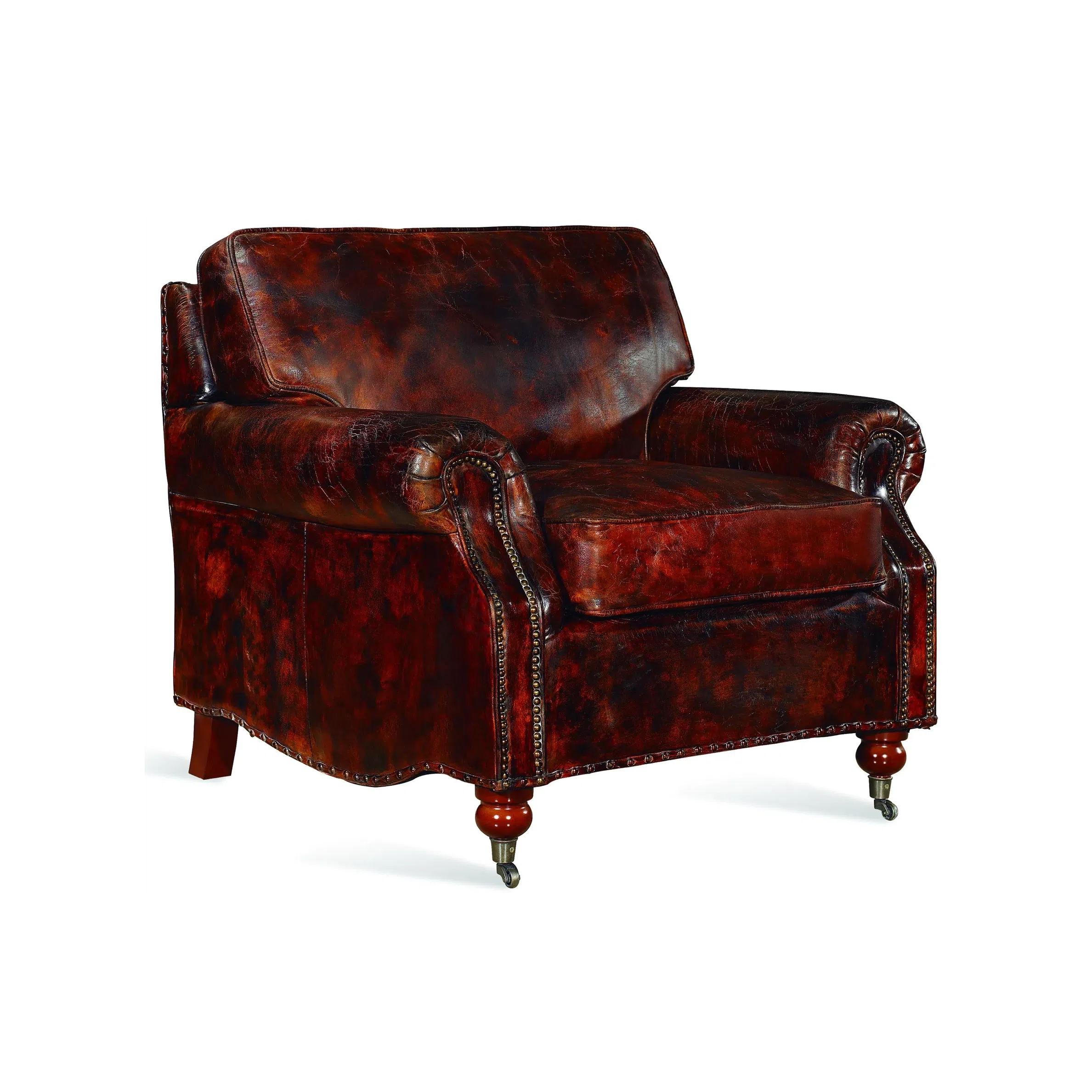 Constructed with a reliable frame of solid wood and plywood, this piece offers both stability and lasting appeal. Design details include classic rolled arms, plush seat and back cushions, and detailed nailhead trim running along the base. The front legs are fitted with decorative casters, enhancing the vintage-inspired industrial aesthetic.