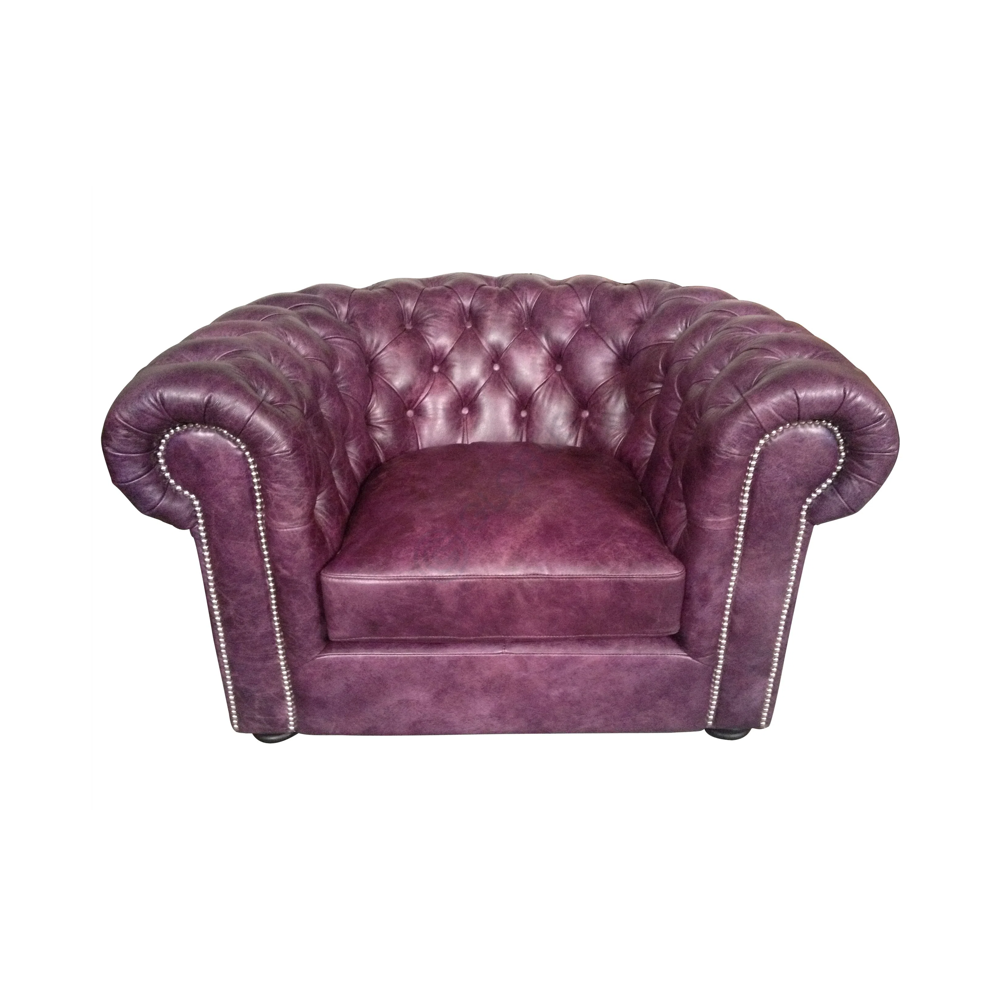 The design features characteristic deep button tufting across the back and scrolled arms, a nod to timeless style. Along the arms, precise nailhead trim adds a touch of crafted detail, highlighting the elegant curves.