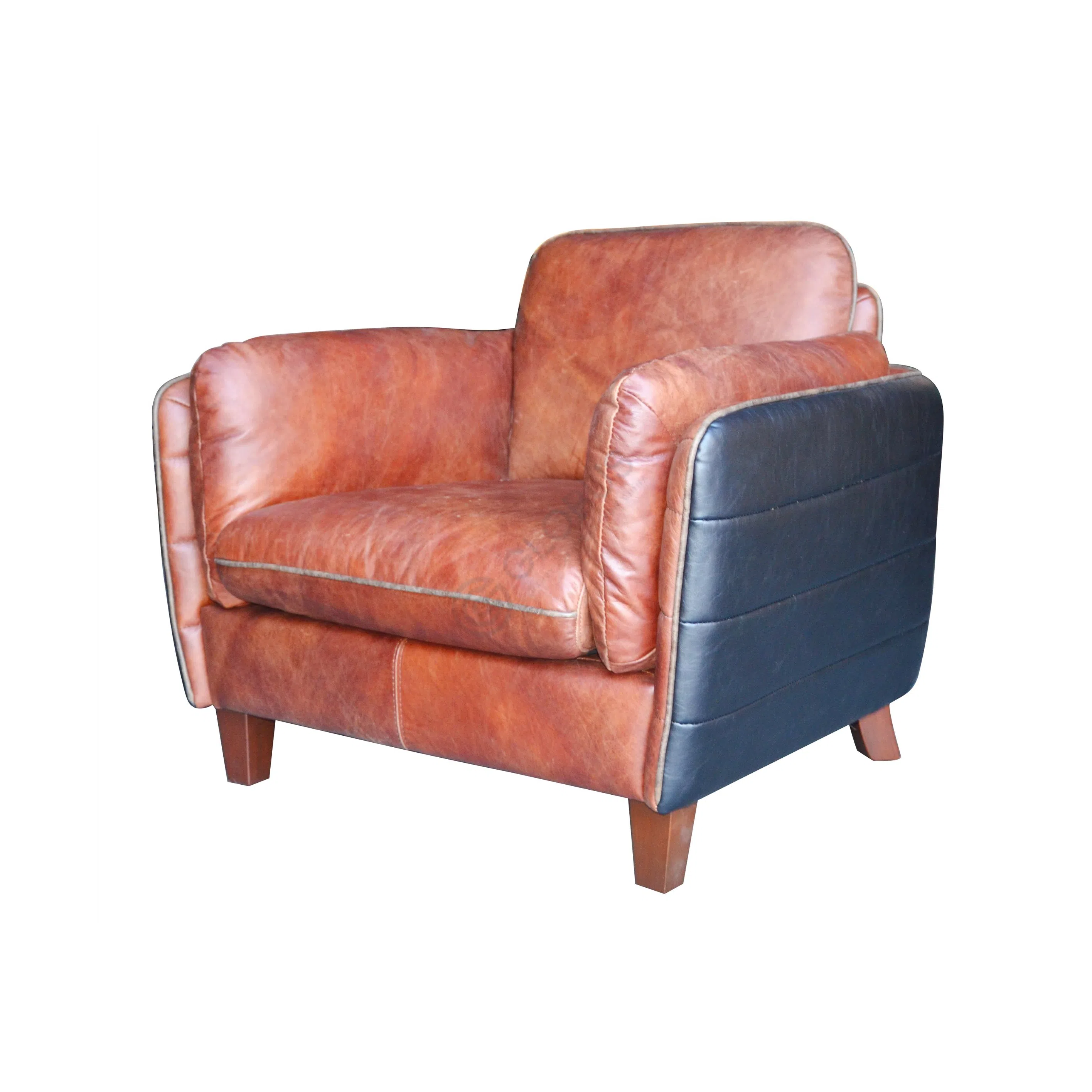 This sofa brings a distinct Loft aesthetic to a living room space. Its main upholstery features a distressed PU in a rich tan tone, offering a warm and inviting appearance with a touch of vintage character. This material is soft to the touch while providing a durable finish.