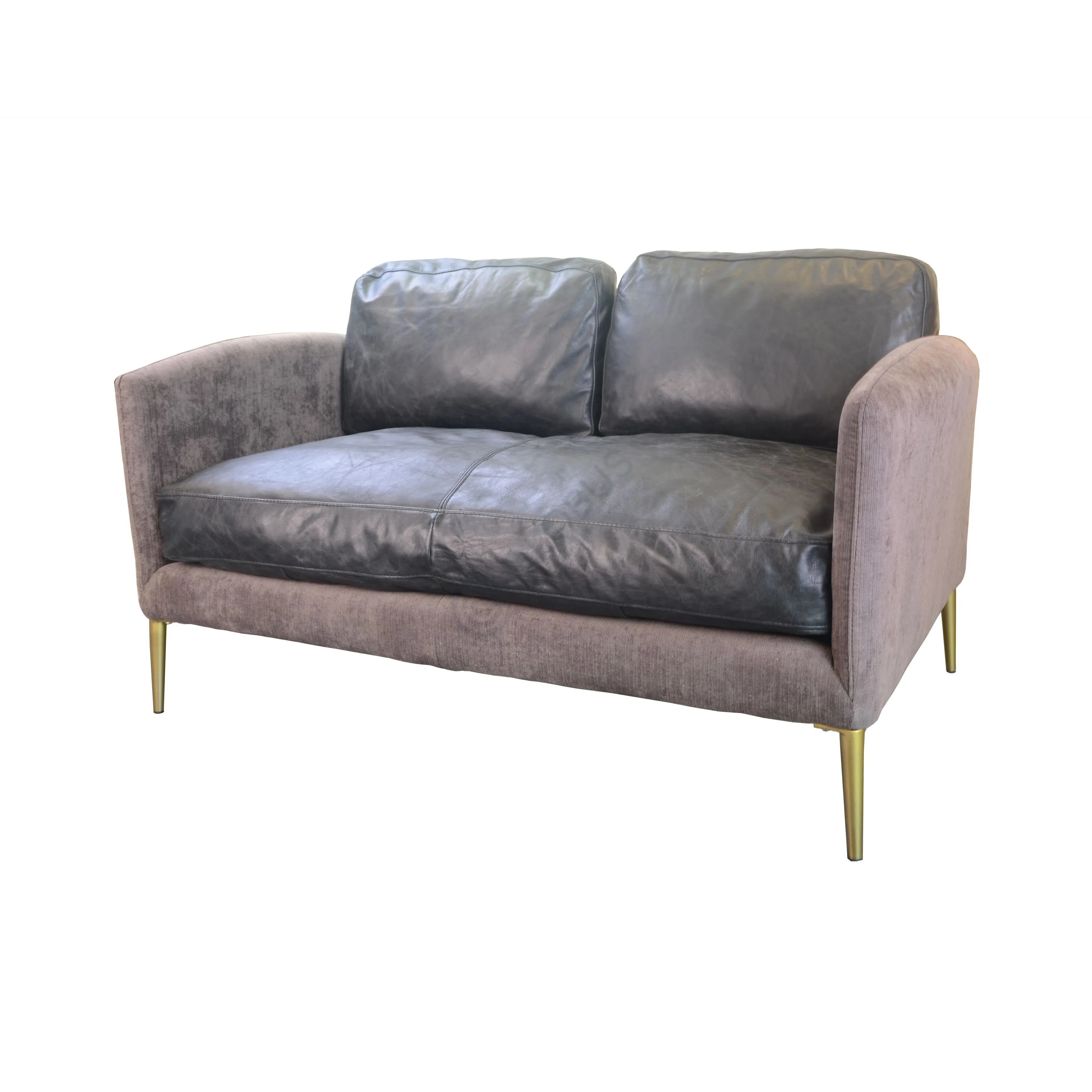 Crafted with a robust internal frame of solid wood and plywood, this piece is built for lasting durability. The seat and back cushion are upholstered in supple leather, offering a comfortable and stylish contrast to the surrounding textile fabric on the frame. The slim, angled metal legs add a touch of lightness and modern elegance to the overall design.