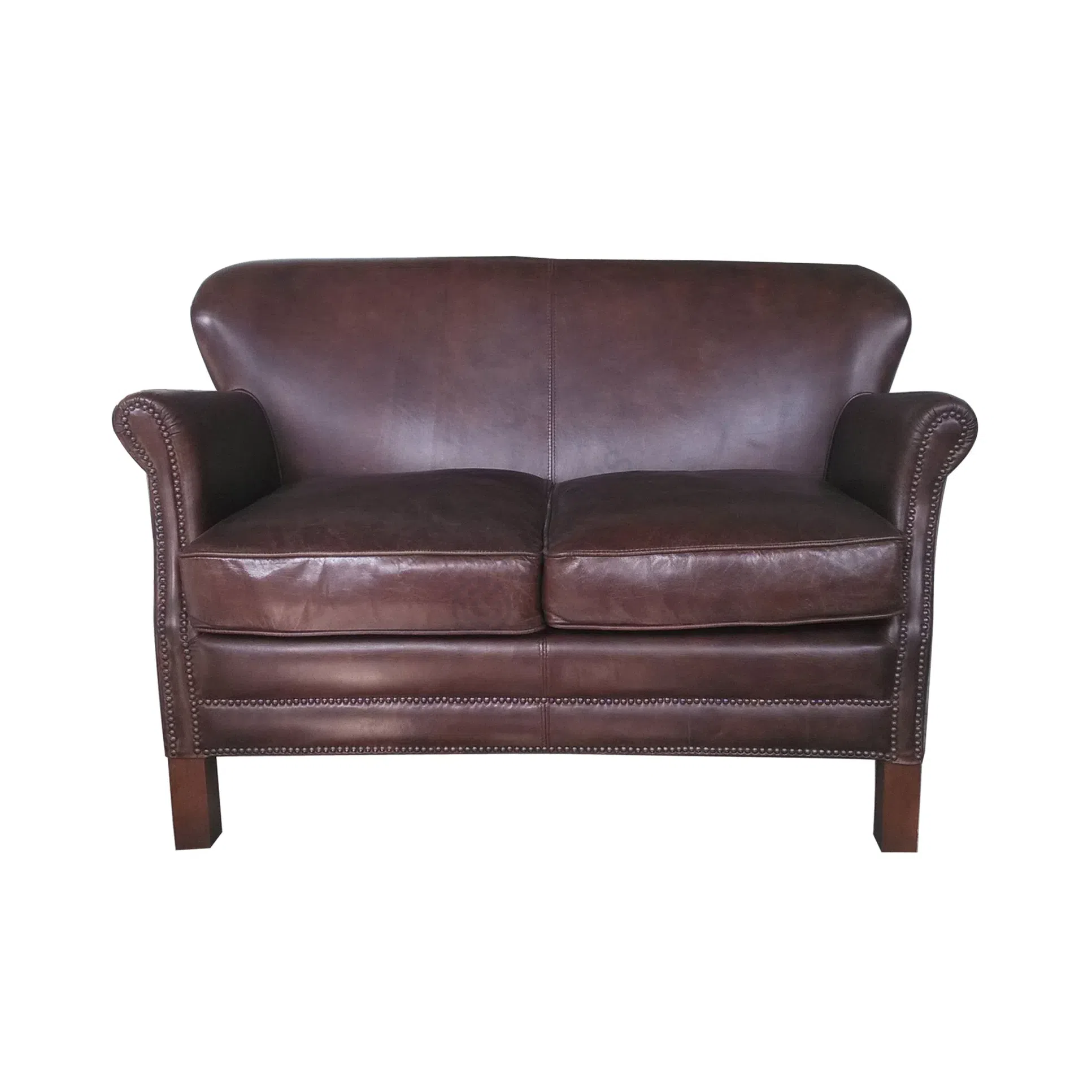 This armchair presents a distinctive character with its rich, deep brown tone and softly aged appearance. Elegant nailhead trim follows the contours of the rolled arms and the lower edge, highlighting its classic form. The robust silhouette makes it a focal point piece within a living space.