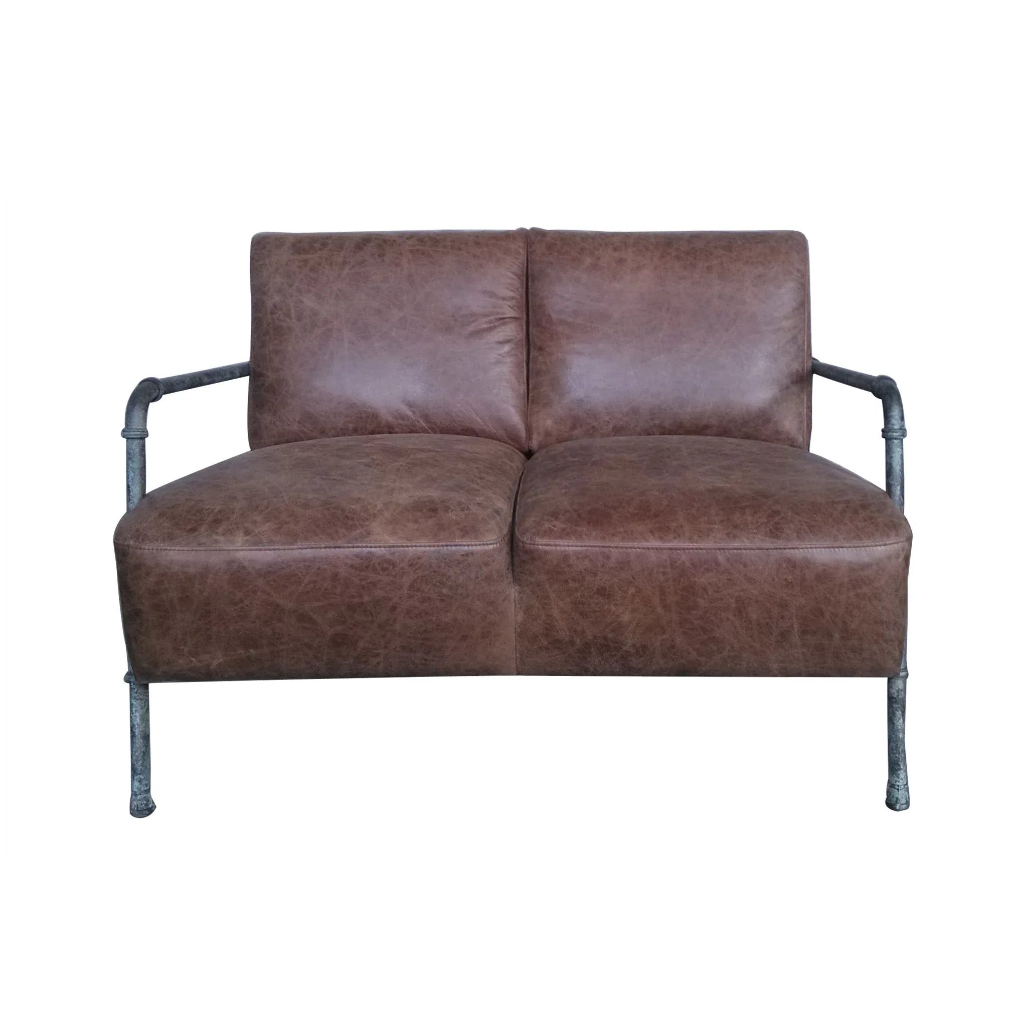 This armchair features a seat and back upholstered in a rich brown PU, displaying a textured, worn finish that adds immediate character. The durable finish provides both visual depth and practical resilience, supported by a solid wood internal structure. It is framed by sturdy metal, designed with an industrial pipe aesthetic that grounds its distinct look.
