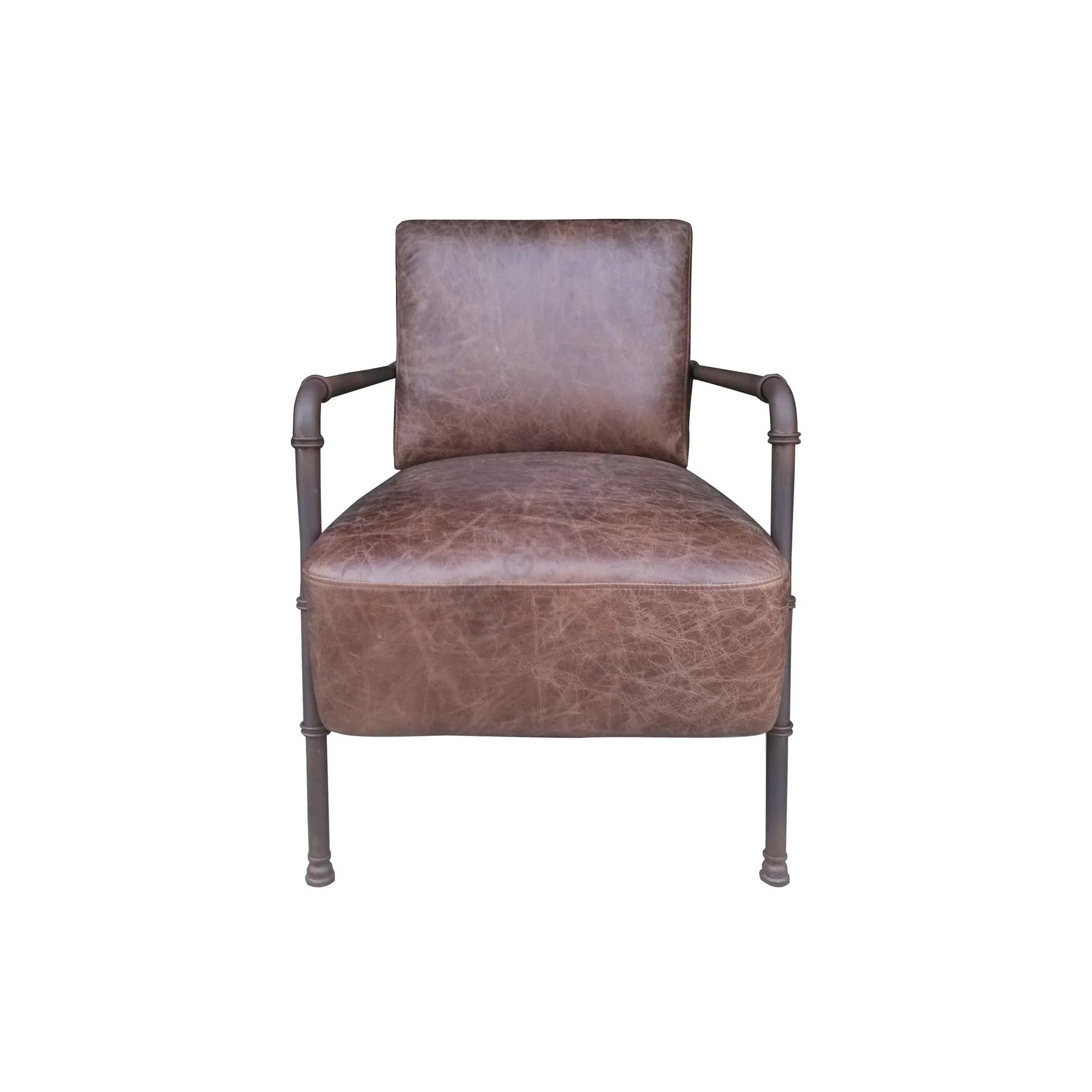 The structure is defined by industrial-inspired elements. Solid wood provides a sturdy internal frame, while exposed metal piping forms the minimalist arms and legs. These metal components are finished with a dark, weathered look, enhancing the urban and industrial aesthetic of the sofa.
