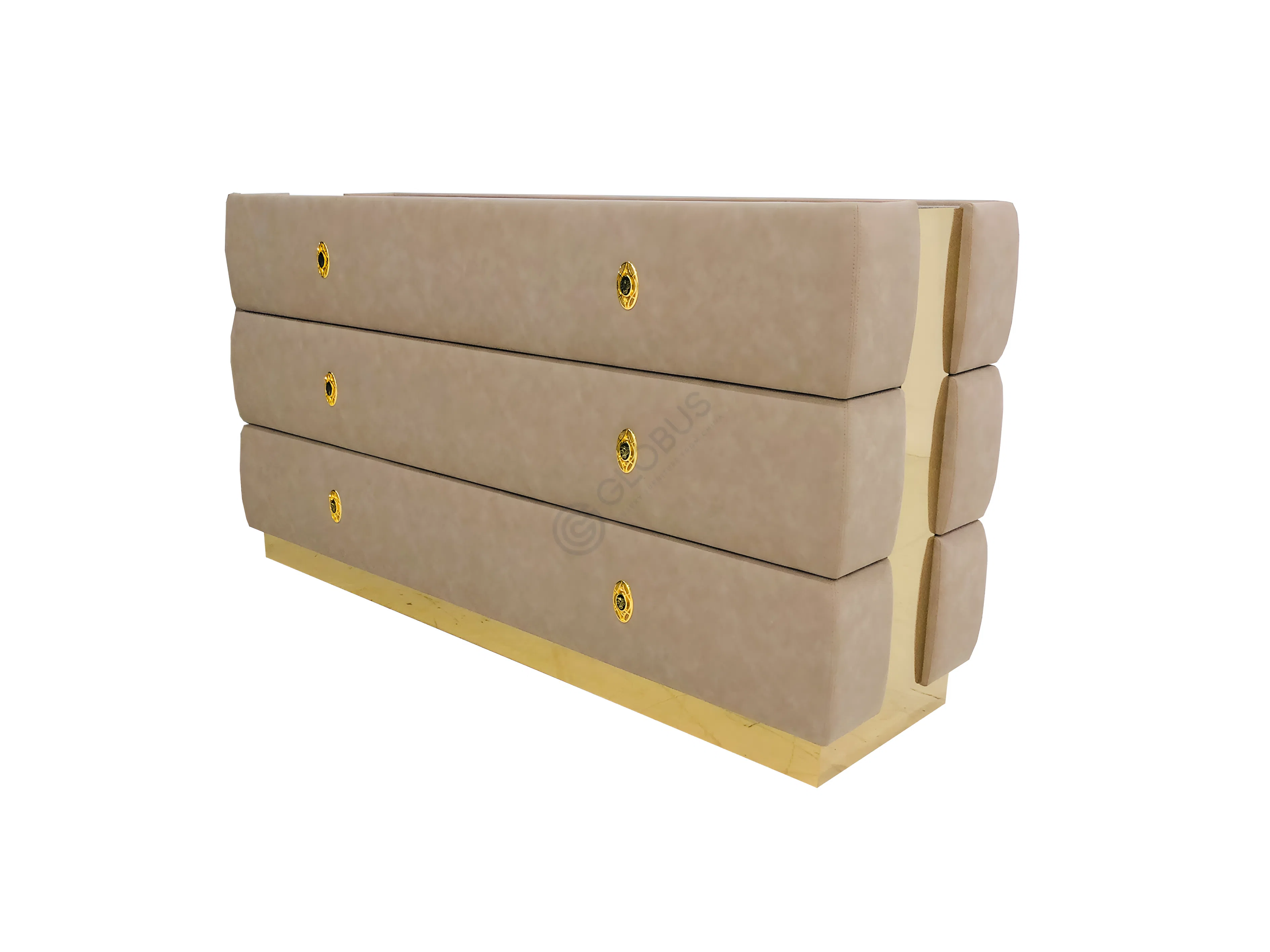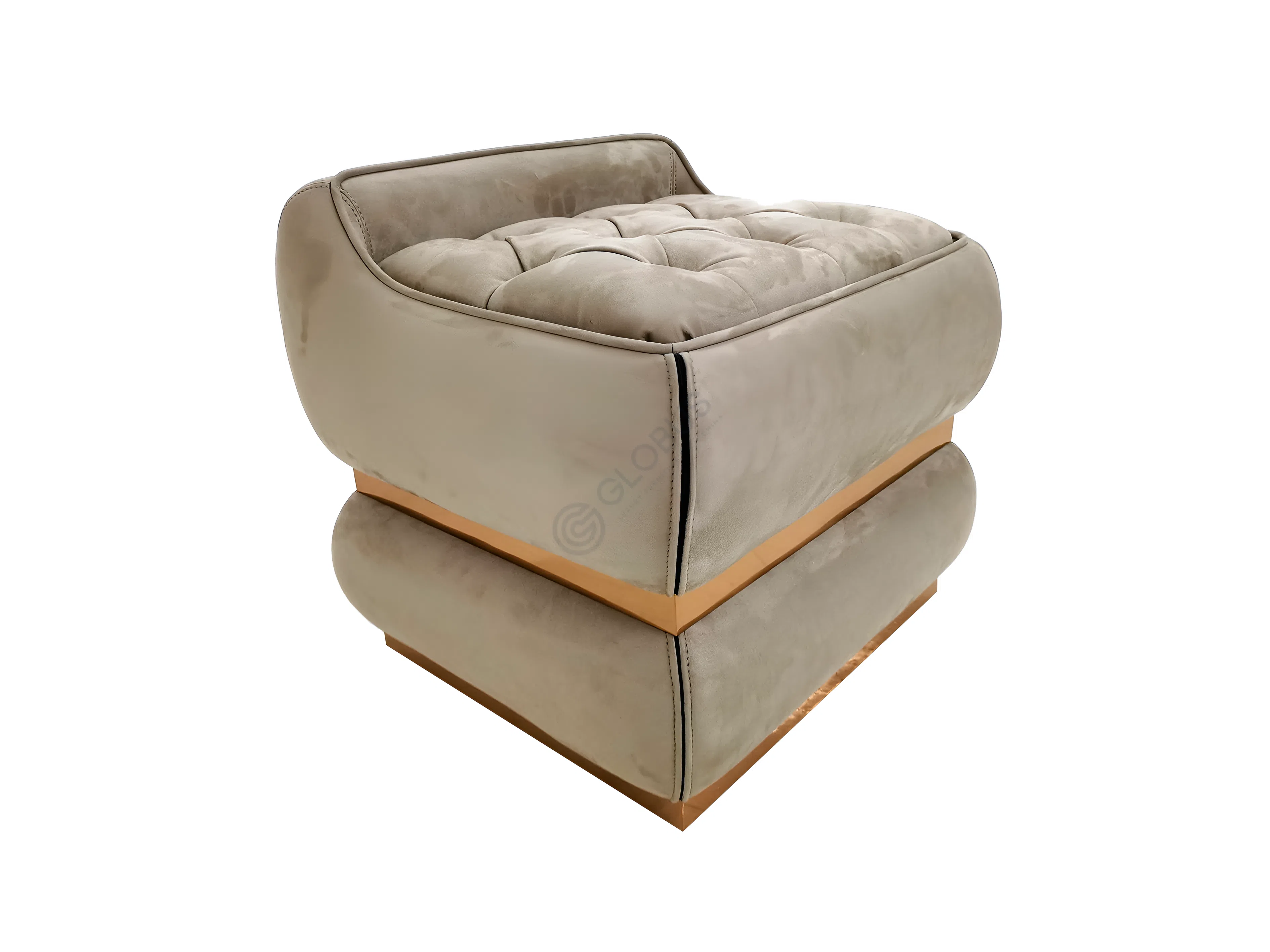 Stainless steel accents at the base introduce a crisp, polished contrast to the warm upholstery and give the bed a subtly elevated presence. The neutral tone pairs comfortably with dark bedding, metallic lighting, and patterned walls, making it a versatile centerpiece for both sleek modern interiors and more classic spaces.