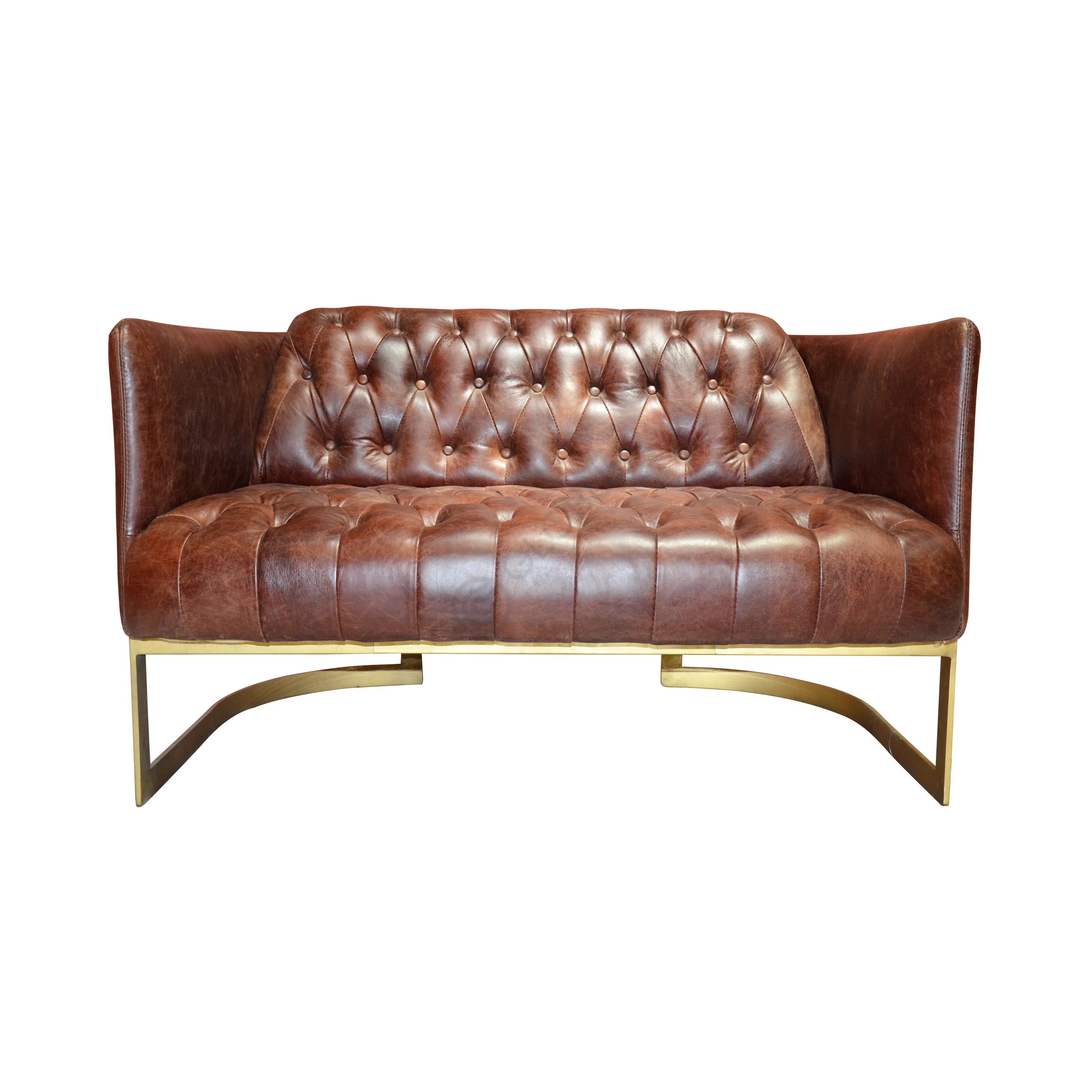 This armchair offers a distinctive blend of classic comfort and industrial design. The rich, dark brown upholstery features elegant tufting across the seat and back cushion, creating a sophisticated yet relaxed look. Its bold silhouette, with invitingly shaped arms, sits confidently on a sleek metal frame with a unique curved base, adding a touch of modern sophistication that defines the Loft style.