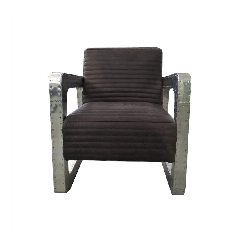 The seating area is upholstered in a rich, brown PU material that offers both durability and a textured appearance reminiscent of aged leather. This ribbed upholstery provides a comfortable and inviting surface. Complementing the warm tone of the seat and back are the cool, industrial elements of the aluminum frame and arms, which are finished with visible rivet details, adding an authentic touch to its aviation-inspired aesthetic.