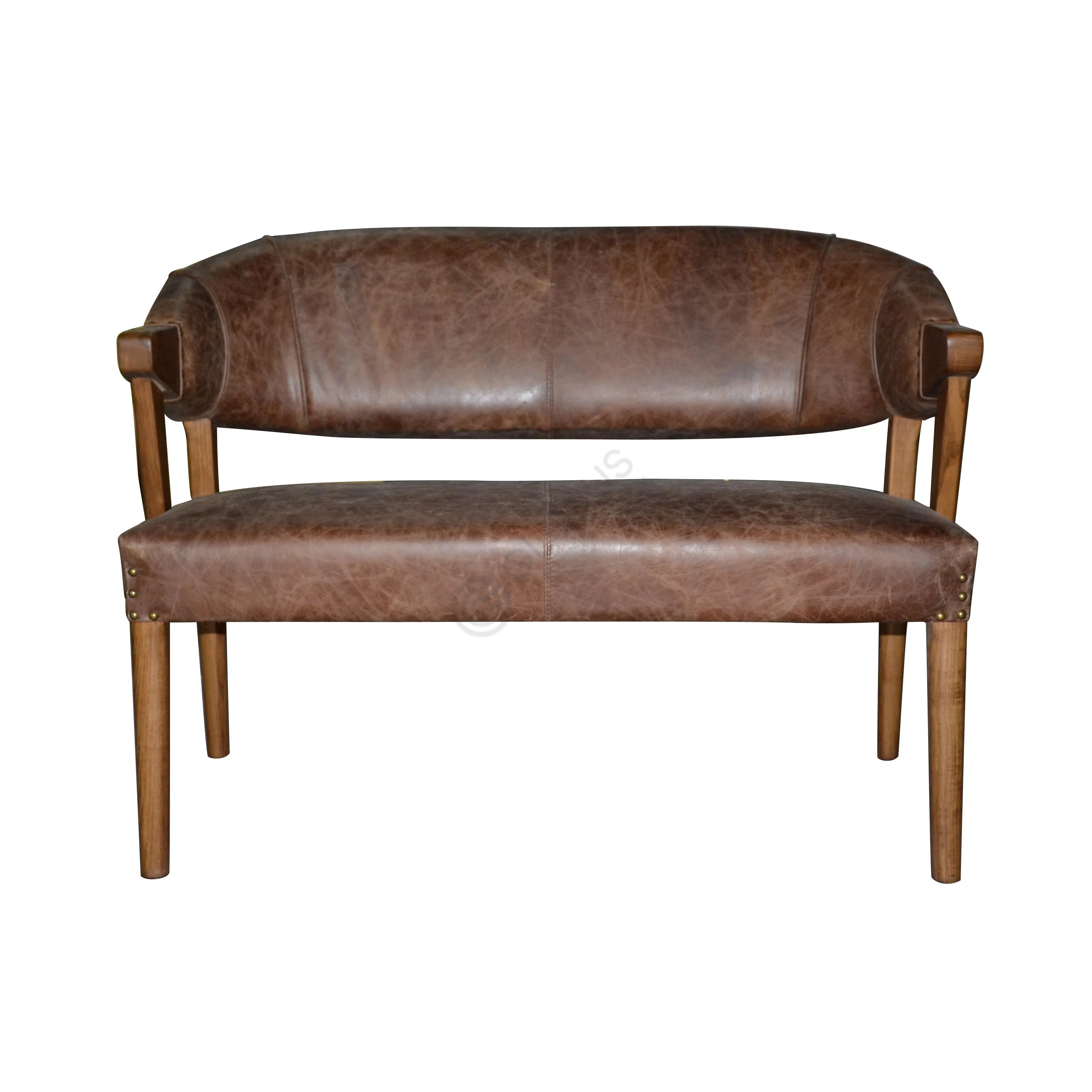 The seat and elegantly curved backrest are generously upholstered in a striking red PU leather, creating a welcoming look. Decorative metal studs carefully line the edges of the upholstery, adding a touch of classic industrial detail that complements the overall aesthetic.