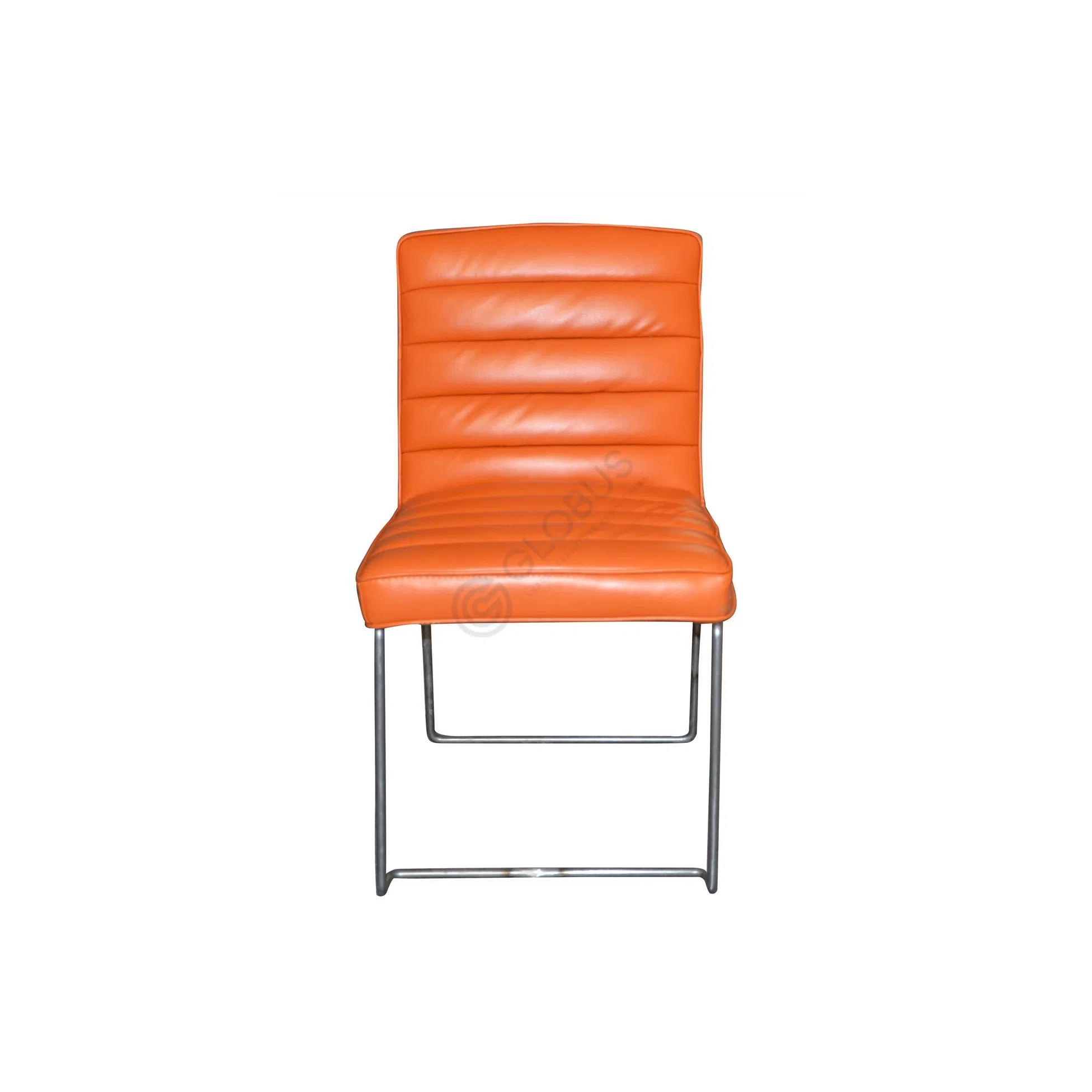 Presenting a modern dining chair featuring a striking orange hue and a sleek profile. The design incorporates comfortable horizontal ribbing on the seat and back for both visual texture and support.
