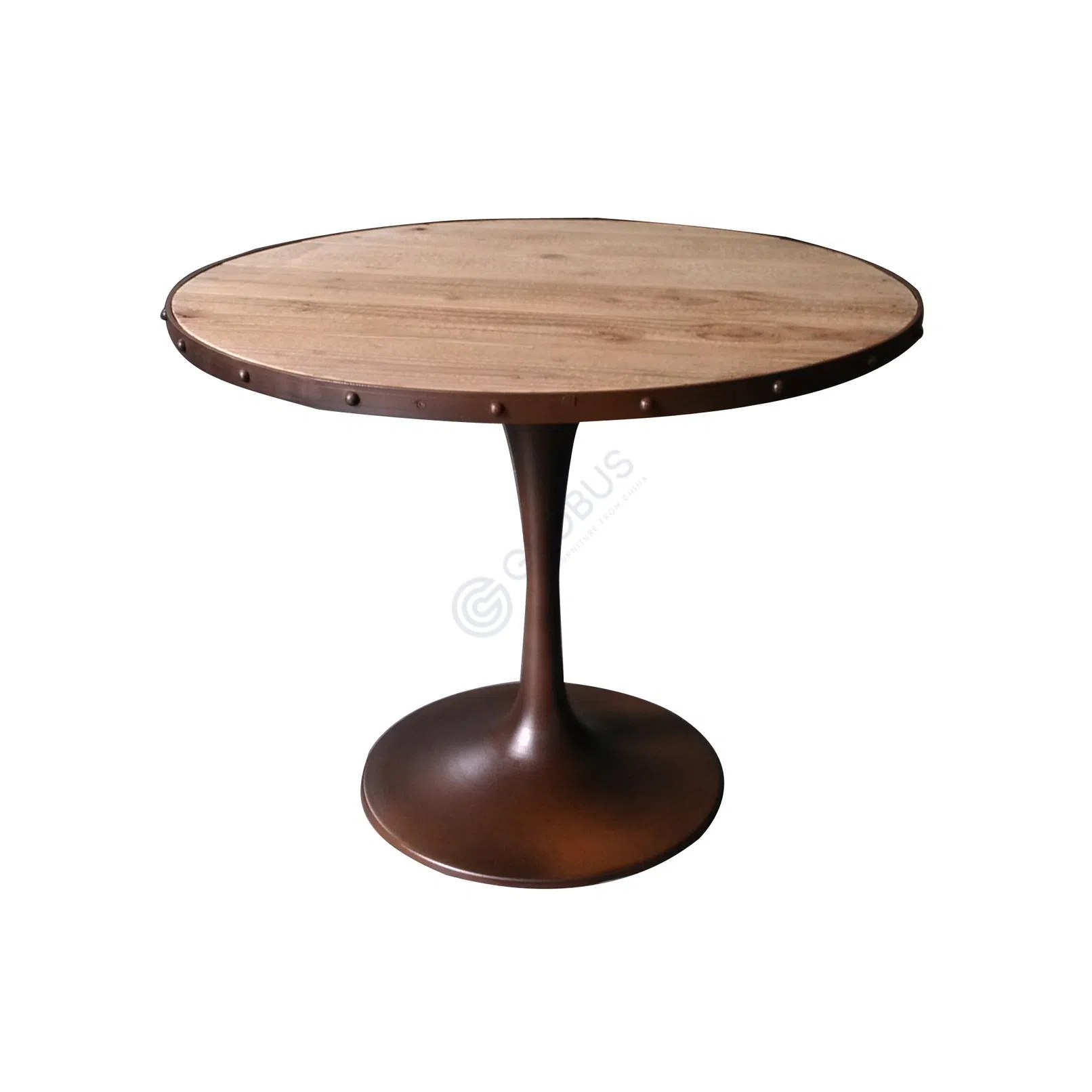 The sturdy iron base, with its clean and fluid lines, provides a strong foundation that anchors the table effortlessly, ensuring it stands gracefully beside your favorite armchair or sofa. The solid wood tabletop, with its inviting round shape, showcases the unique grain patterns of the wood, bringing a touch of nature's artistry into your home.