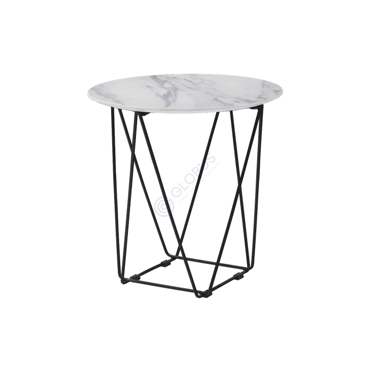 This coffee table features a sleek round top crafted from black sintered stone. Its surface displays elegant veining in varied shades, providing the sophisticated look of natural stone with enhanced durability and resistance. The smooth finish offers a refined tactile experience and makes the top easy to care for.