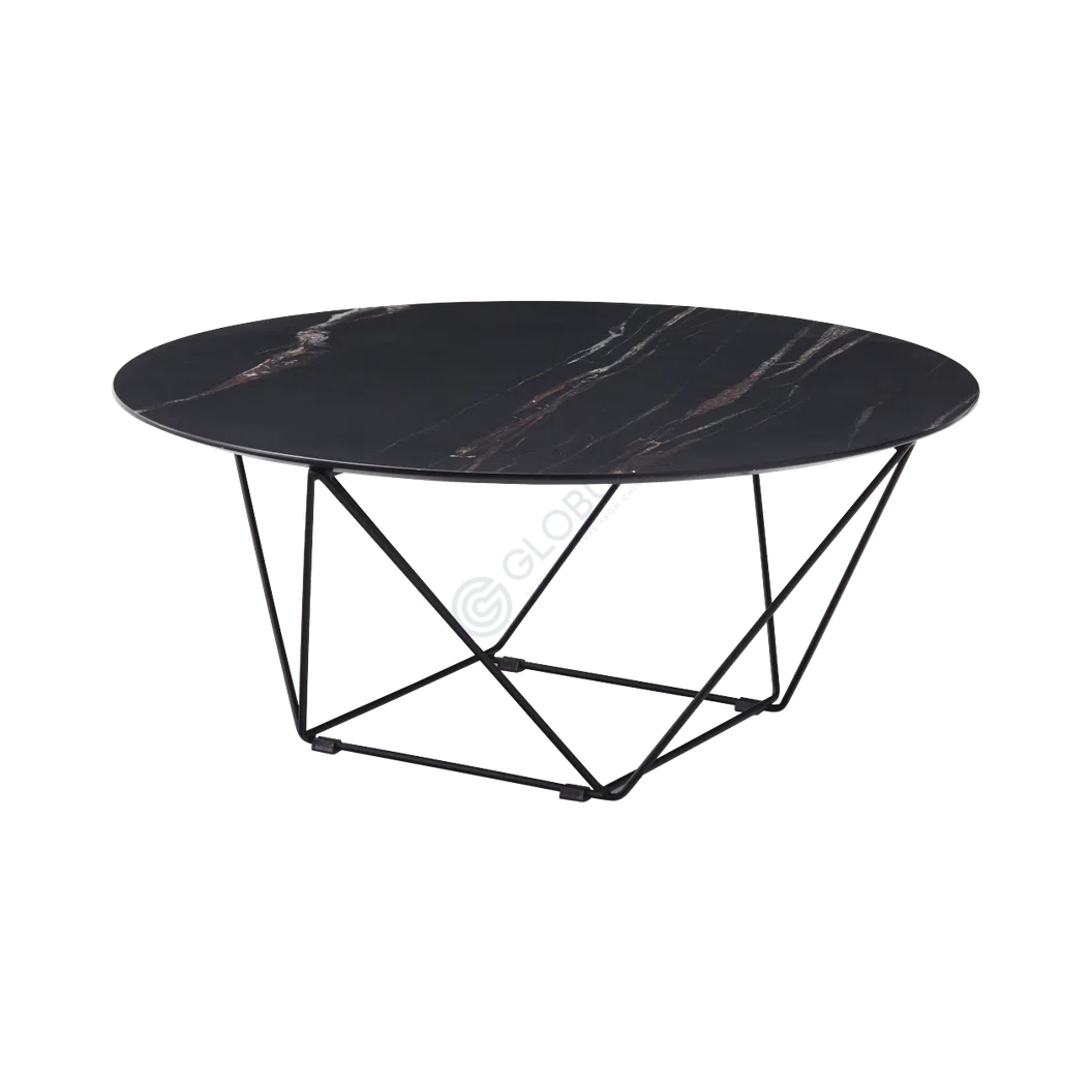 The round top is crafted from sintered stone, offering a durable surface with the beautiful, intricate veining characteristic of natural marble. This provides a luxurious feel and is resistant to everyday wear.