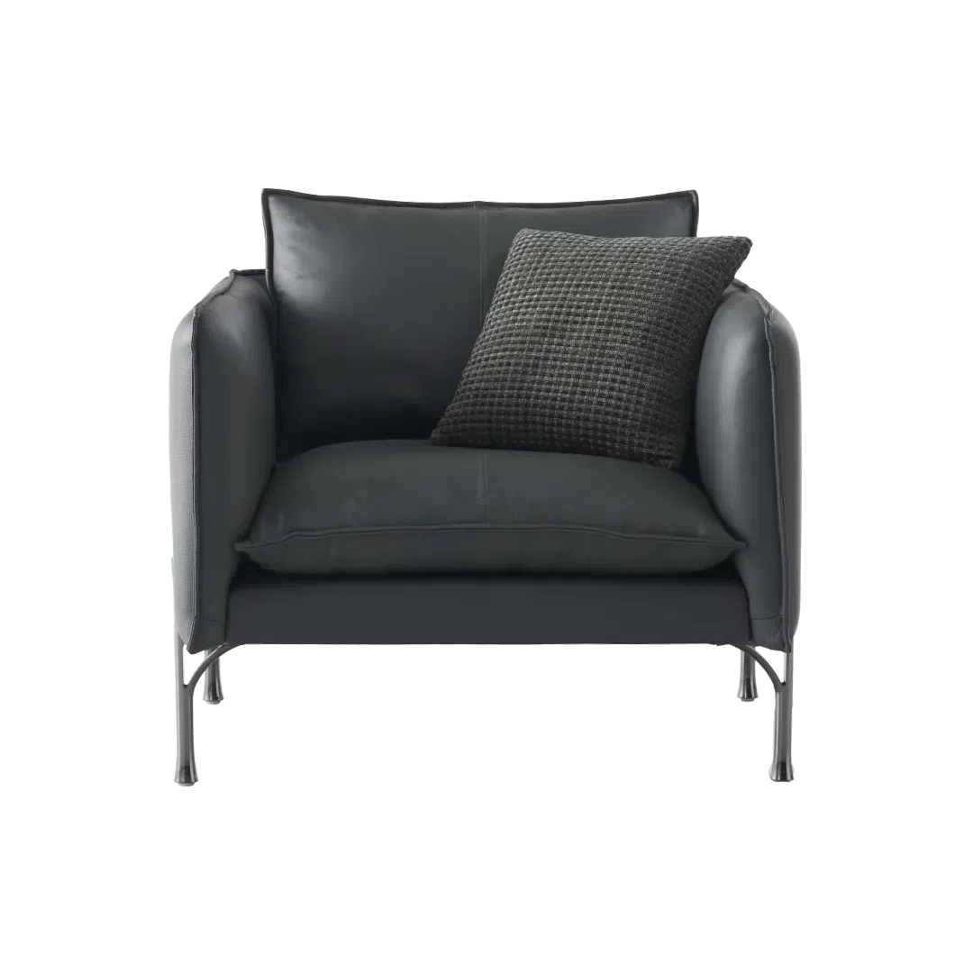 Crafted with a robust internal frame of solid wood and plywood, this piece provides stable and reliable support. It rests upon slender metal legs that elevate the design, adding to its light, modern profile. The cushions are generously filled with feather, creating a soft and comfortable experience perfect for relaxing.
