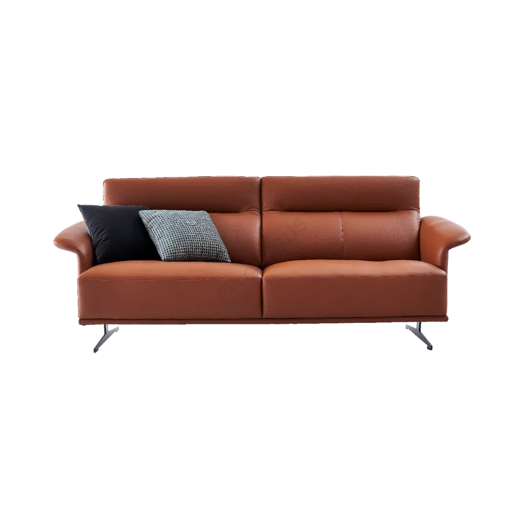 Crafted with attention to detail, the sofa features luxurious leather upholstery that provides a smooth, supple surface. The seating is generously filled, utilizing feather for a plush feel that encourages unwinding. Beneath the upholstery, a robust frame constructed from solid wood ensures lasting durability and stability, supported by sleek carbon steel legs that add a touch of refined style and lightness to the overall design.