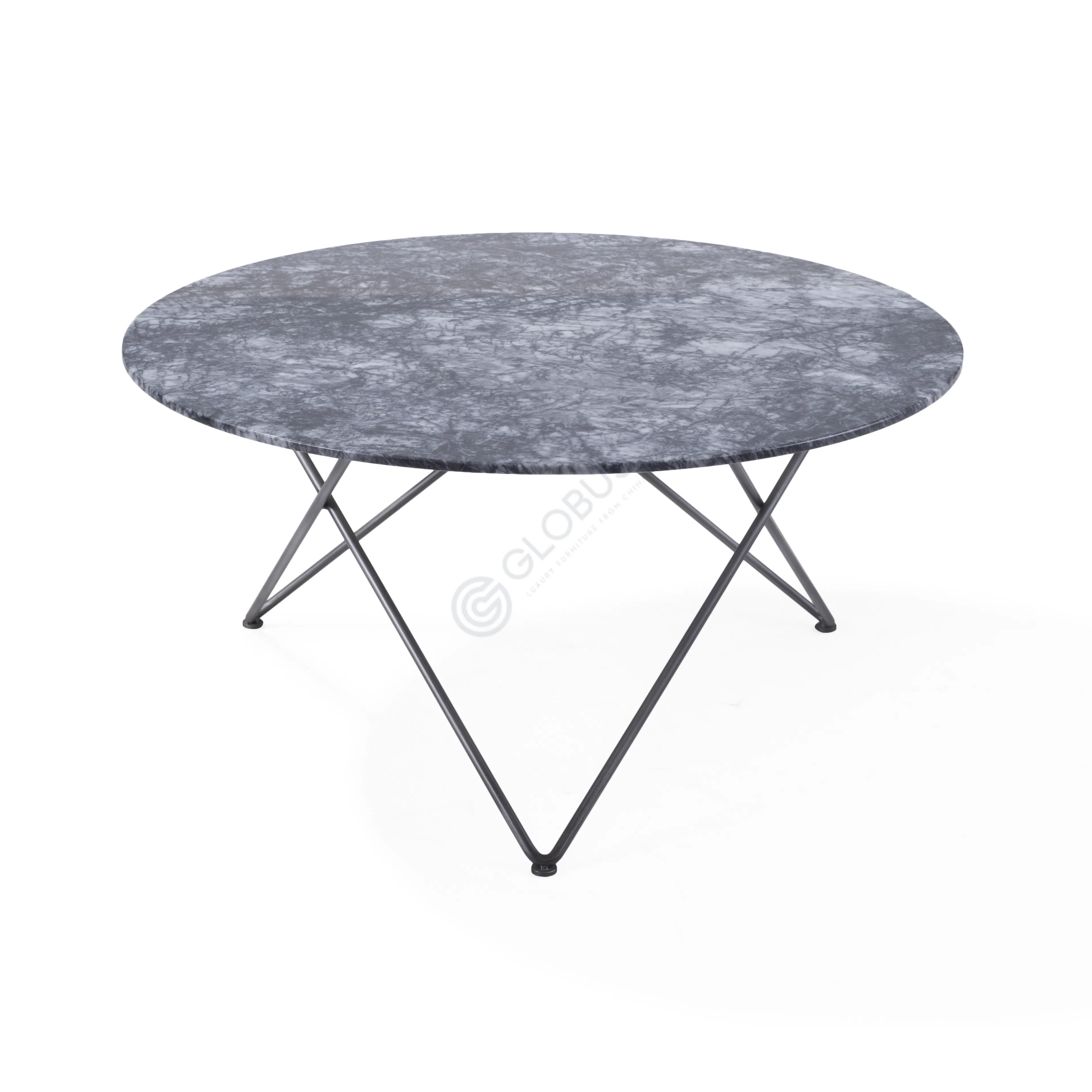 The base features a crisscross design crafted from carbon steel, providing a strong yet lightweight structure. Its minimalist frame complements the marble's natural texture while ensuring stability and durability.