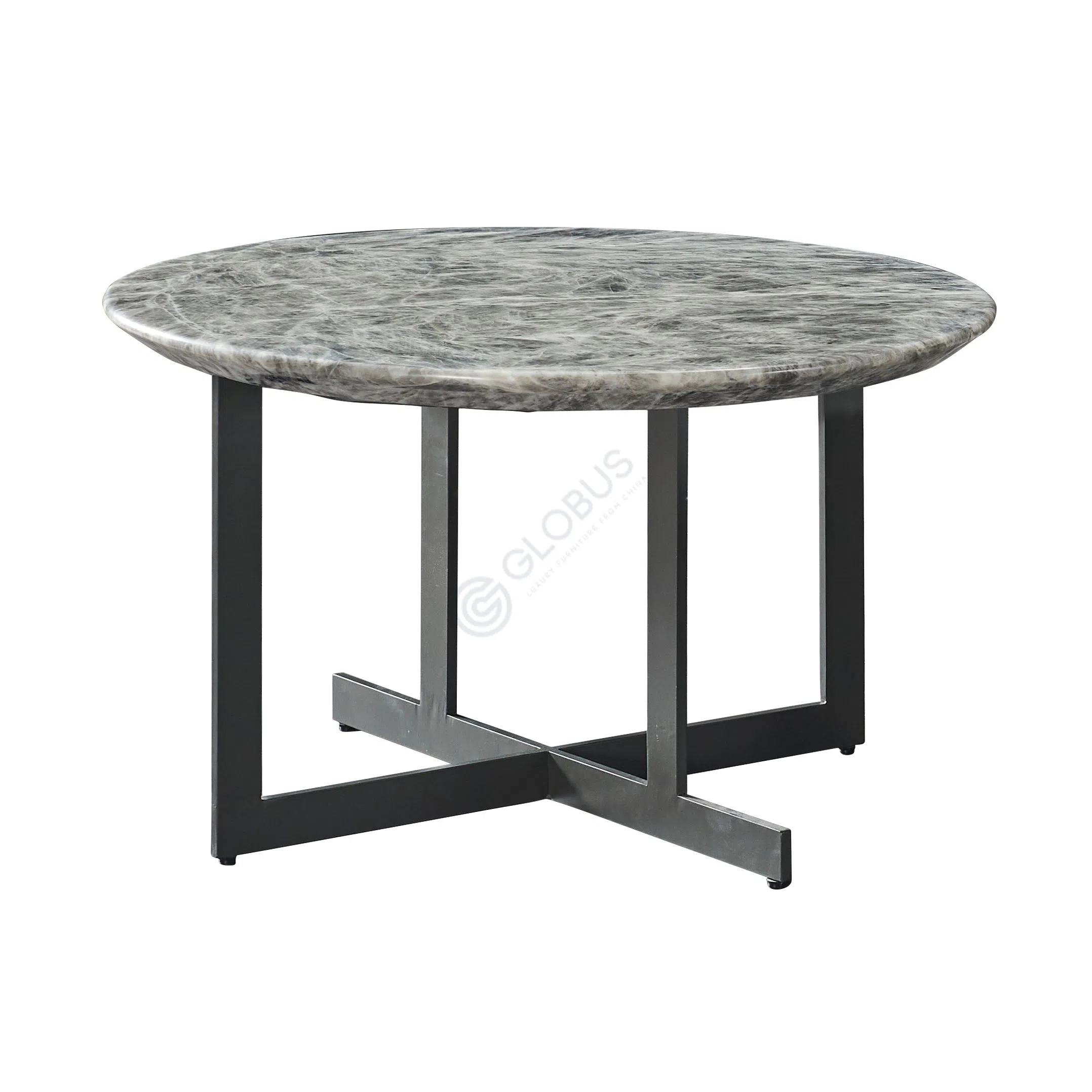 The base is constructed from sturdy carbon steel, combining a sleek design with excellent stability. Its minimalistic geometric framework complements the organic form of the marble top, resulting in a balanced and harmonious aesthetic. The contrast between the steel's matte finish and the marble's natural veining adds depth to its contemporary design.