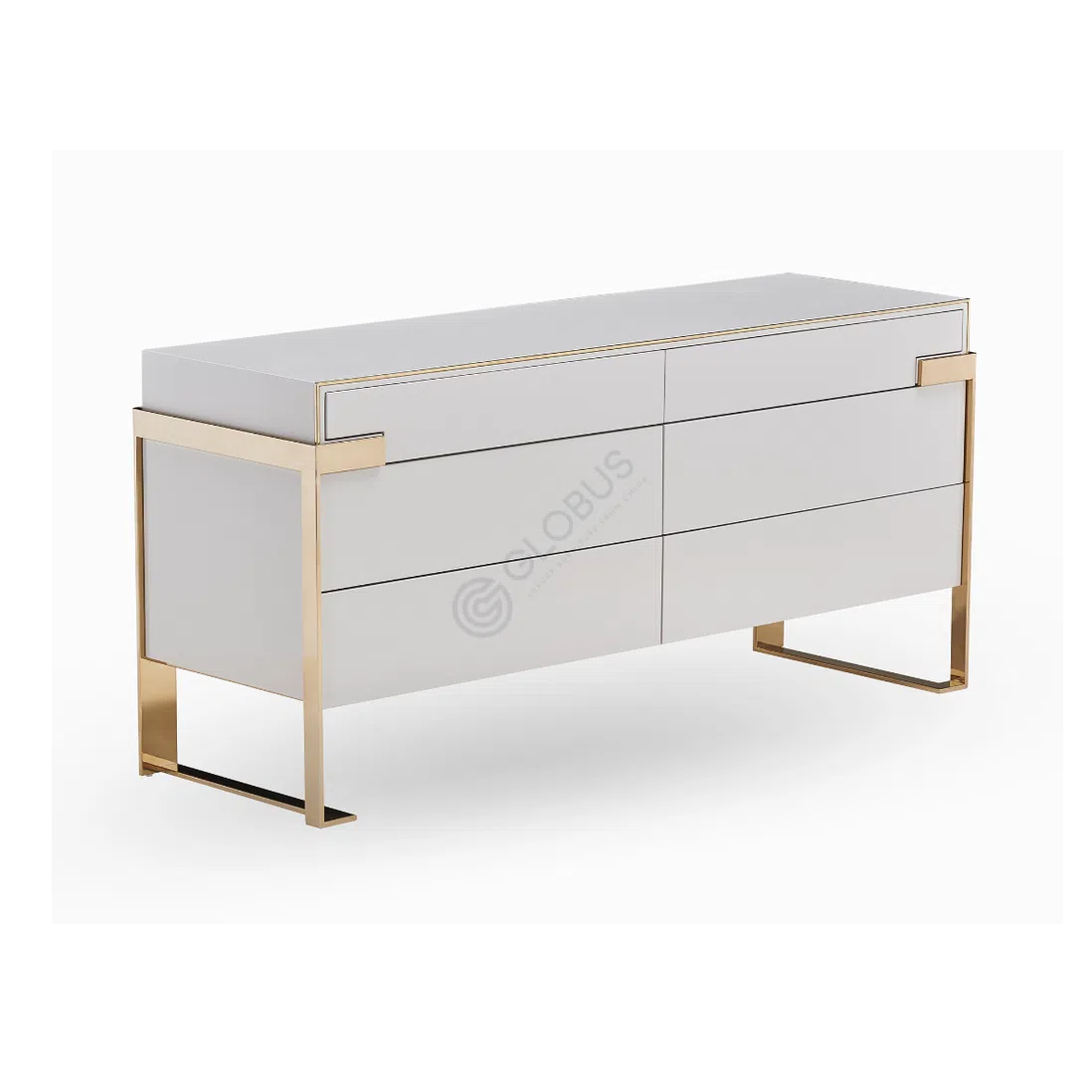 Six generously sized drawers offer practical storage, featuring a smooth, high-gloss finish that enhances the piece's contemporary look. Delicate stainless steel trim accents the drawers, adding a subtle detail that highlights the clean lines.