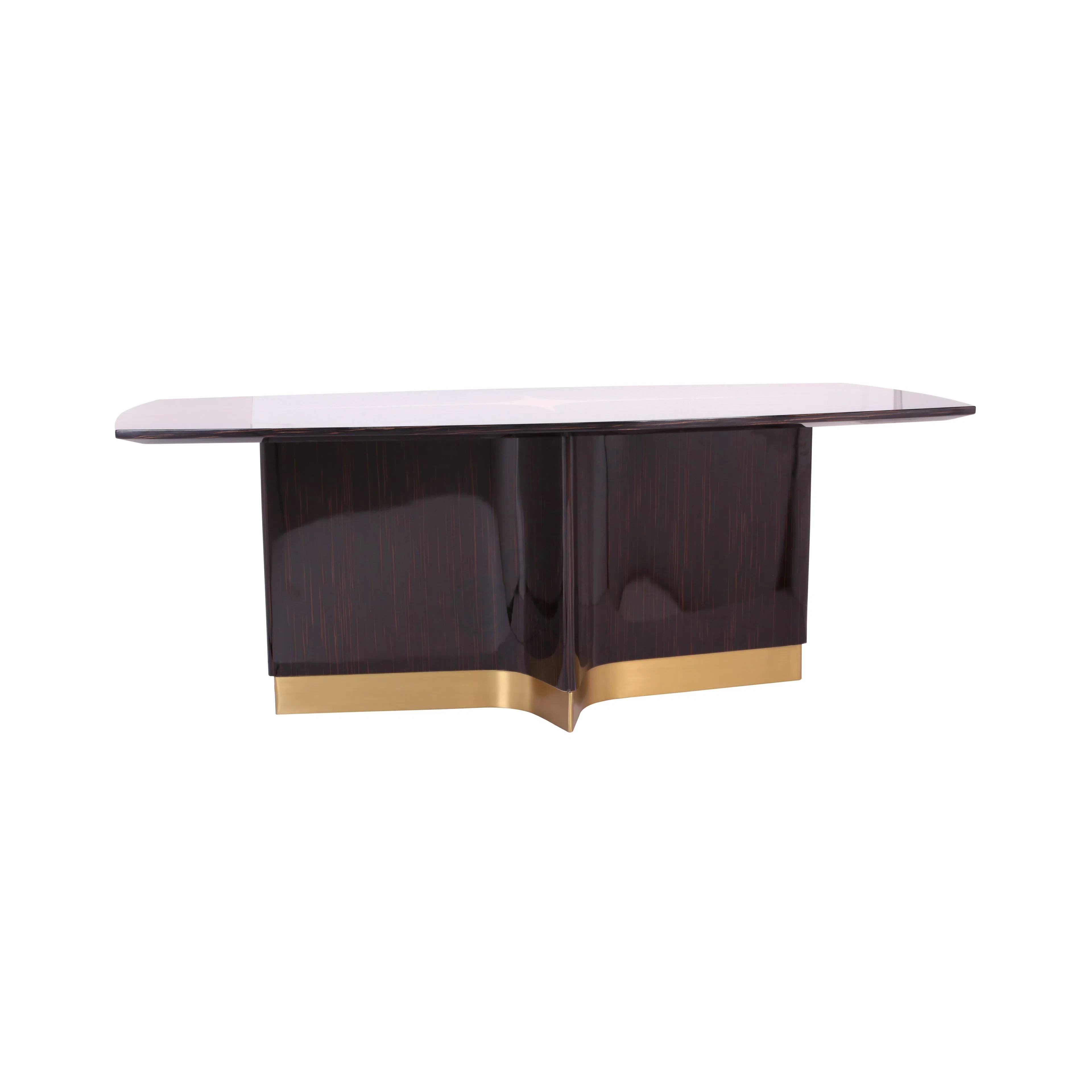 Supporting this exquisite top is a substantial base, crafted from MDF and natural veneer, which incorporates a distinctive curved element. This structural form is beautifully defined by polished stainless steel trim in a warm metallic finish, adding a touch of refined modern detail at the edges and base.