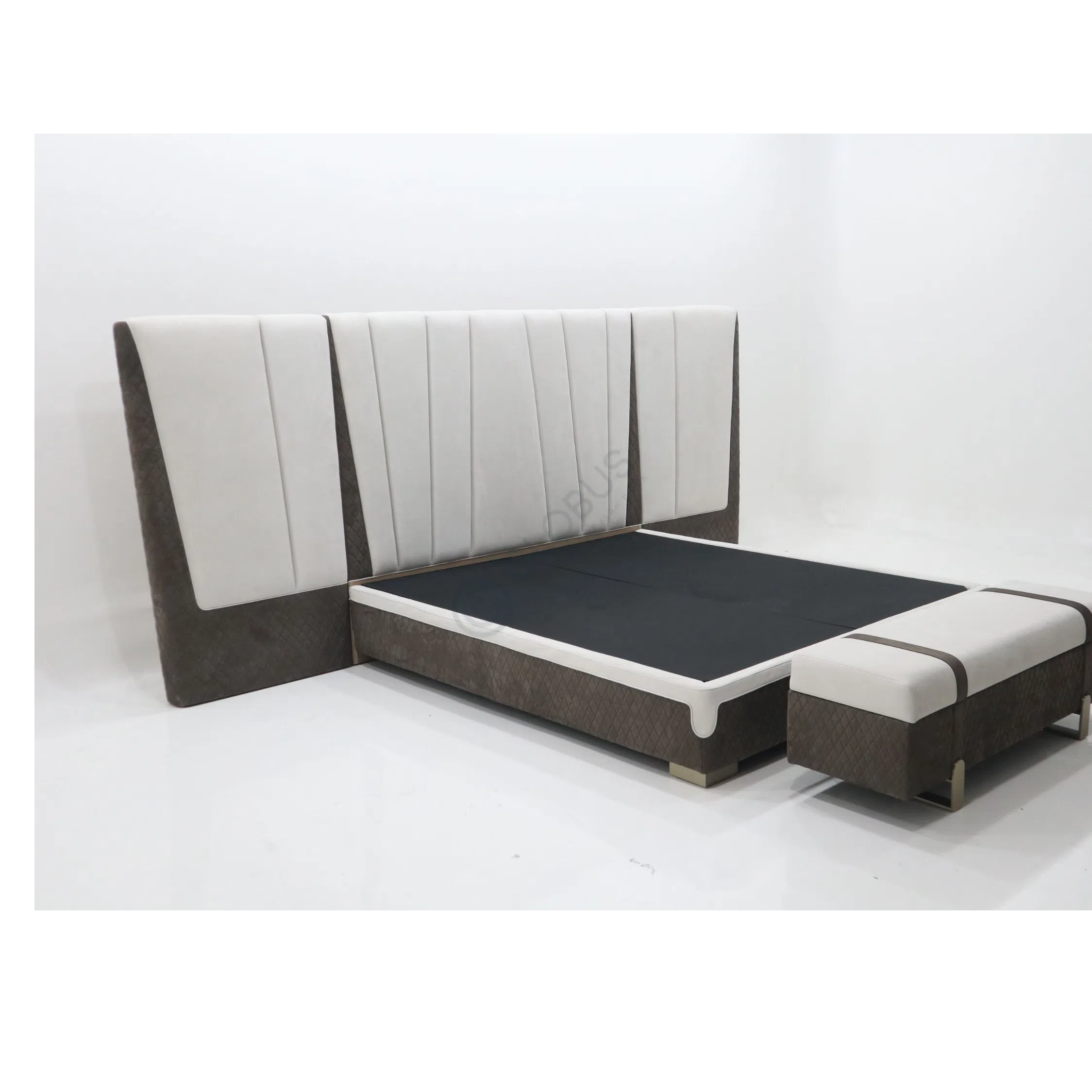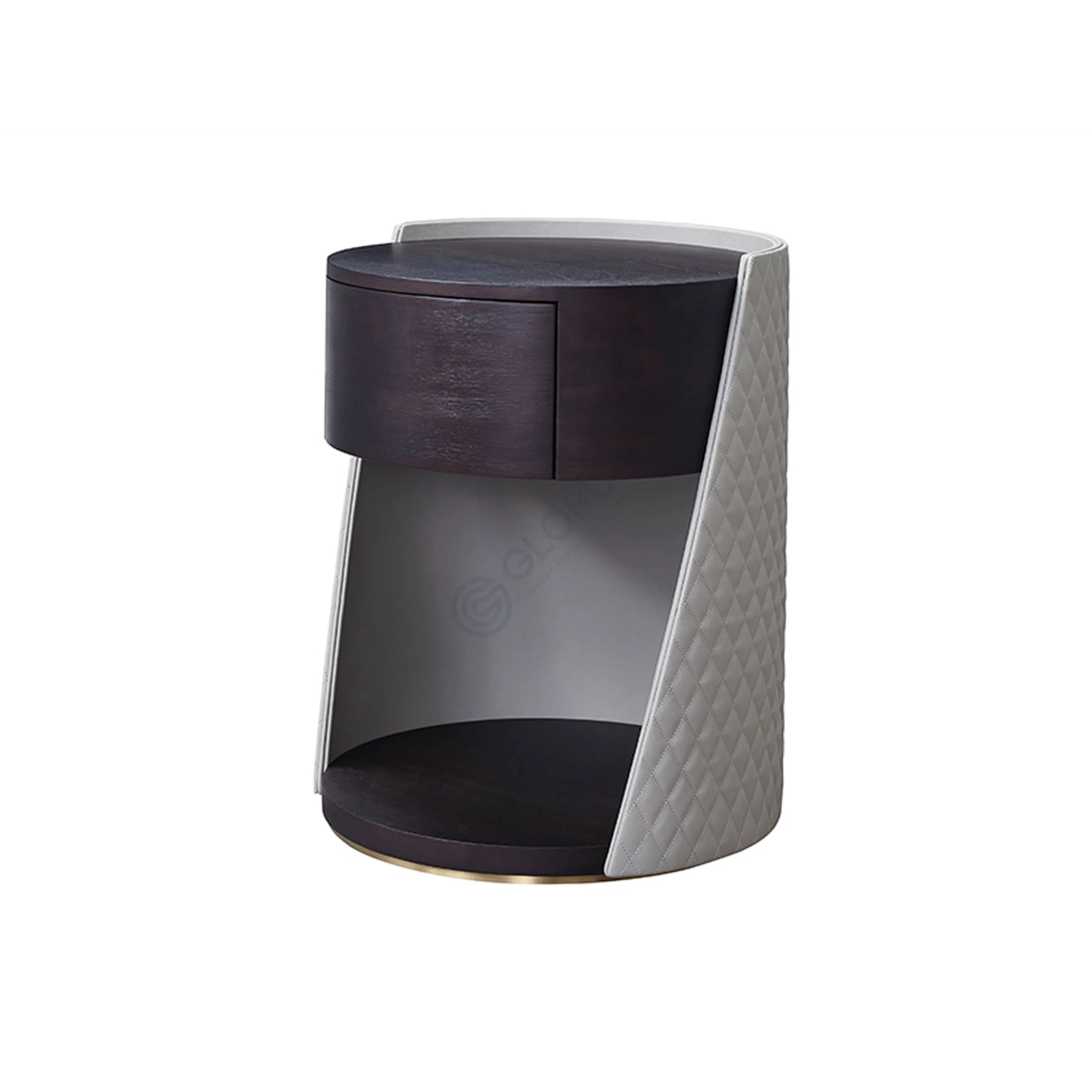 This modern dressing table brings a touch of refined elegance to the bedroom. Its distinctive design features a structured central body flanked by gracefully curved supports. Crafted using a thoughtful combination of materials, the piece showcases a tabletop finished in natural veneer, offering a warm, inviting surface. The curved supports are upholstered in a soft PU with a delicate quilted pattern, providing texture and a sophisticated feel. A subtle stainless steel accent band encircles the base of each support, adding a sleek detail. The design includes practical features for daily use. The tabletop lifts to reveal a hidden mirror and a compartmentalized storage area, ideal for organizing makeup and accessories. A discreet drawer is integrated beneath for additional storage, maintaining the piece's clean lines. This dressing table serves as both a functional vanity and a stylish furniture element.